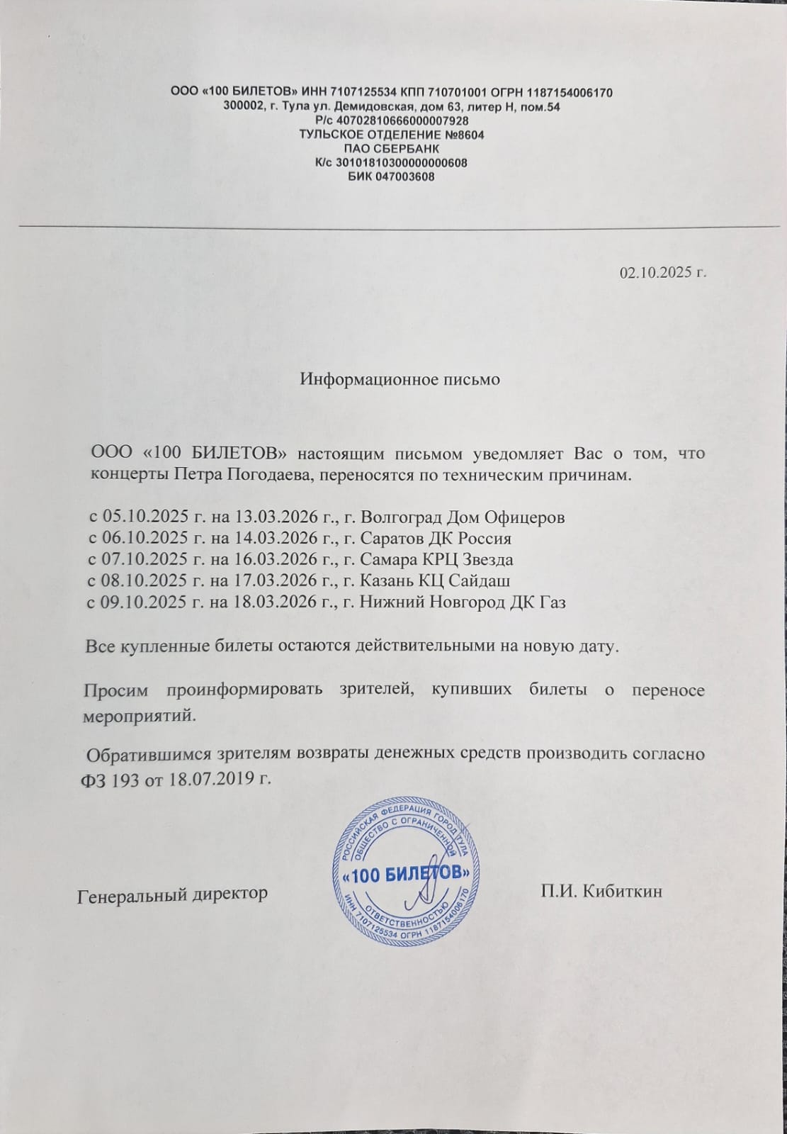 Уважаемый клиент! Спешим сообщить, что по информации, полученной от организатора, сольный концерт Романа Постовалова «Любовь, милиция и недостаточно пятнистые березы», запланированный на 17 октября 2024 года в КРК «Пирамида», перенесен на 18 октября 2025 года. Ранее приобретенные билеты действительны на новую дату, обменивать их не нужно. Если вам не удобно посетить мероприятие в новую дату, вы можете вернуть билет по кнопке в личном кабинете во вкладке «Заказы». Деньги за электронные билеты вернутся автоматически в полном объёме на карту, с которой была произведена оплата. Если вы купили билет в кассе Ticketland.ru за наличный расчет, то обратитесь, пожалуйста, на почту: vozvrat@ticketland.ru. С уважением, команда поддержки Ticketland