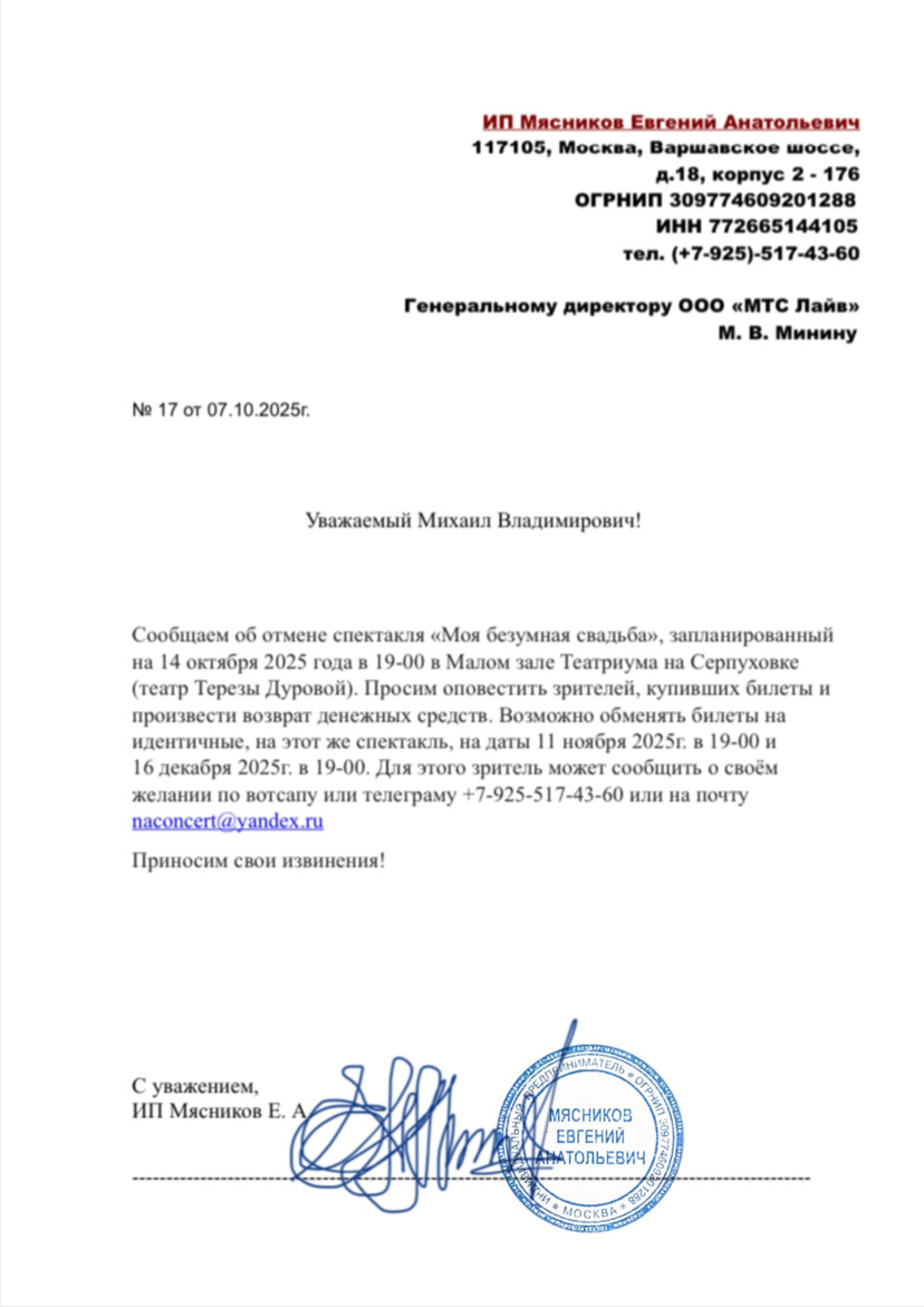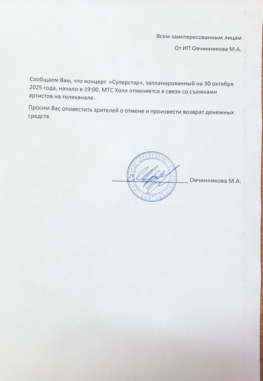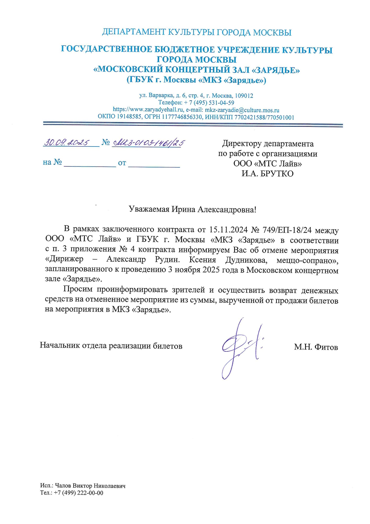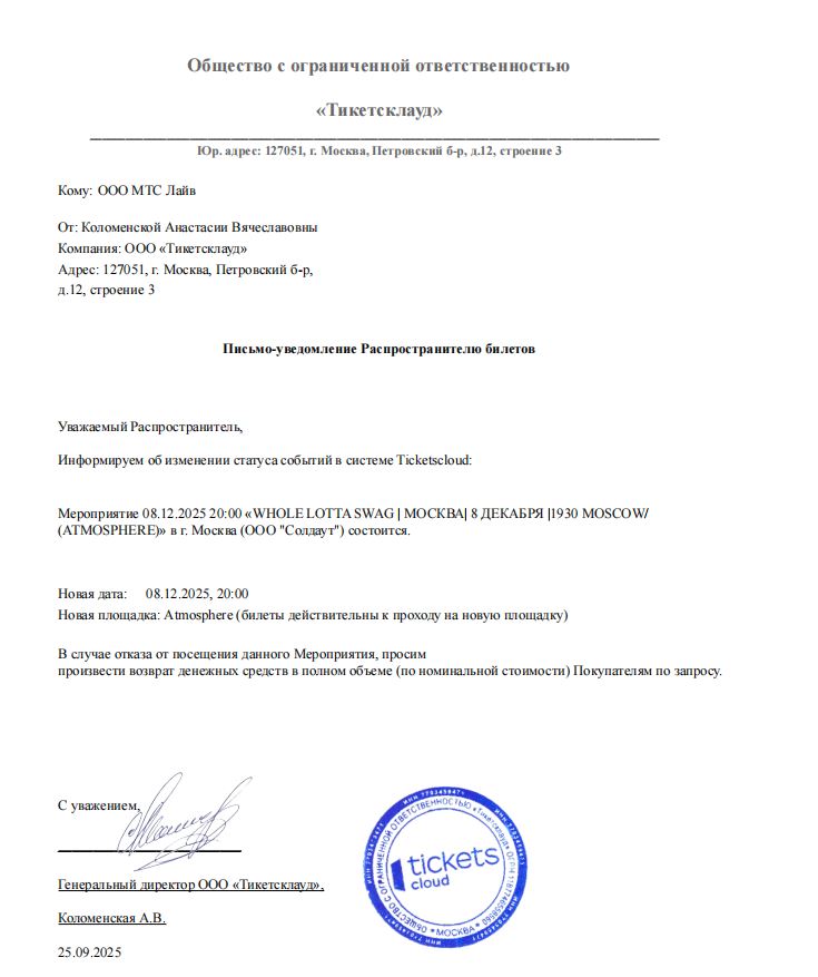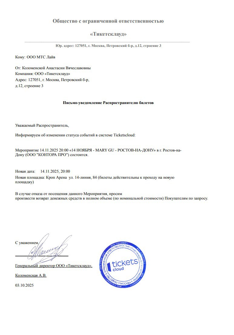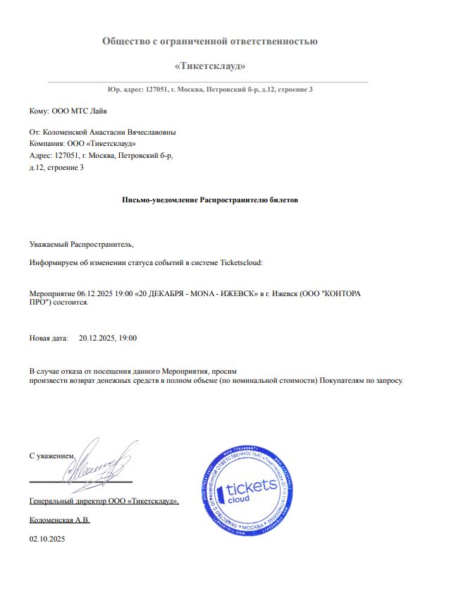Спешим сообщить, что по информации, полученной от организатора, концерт MAYOT, запланированный на 26 октября в 20:00 в МТС Live Холле, отменён. Деньги за электронные билеты вернутся автоматически в полном объёме на карту, с которой была произведена оплата. Если вы купили билет в кассе Ticketland.ru за наличный расчет, то обратитесь, пожалуйста, на почту: vozvrat@ticketland.ru. С уважением, команда поддержки Ticketland.