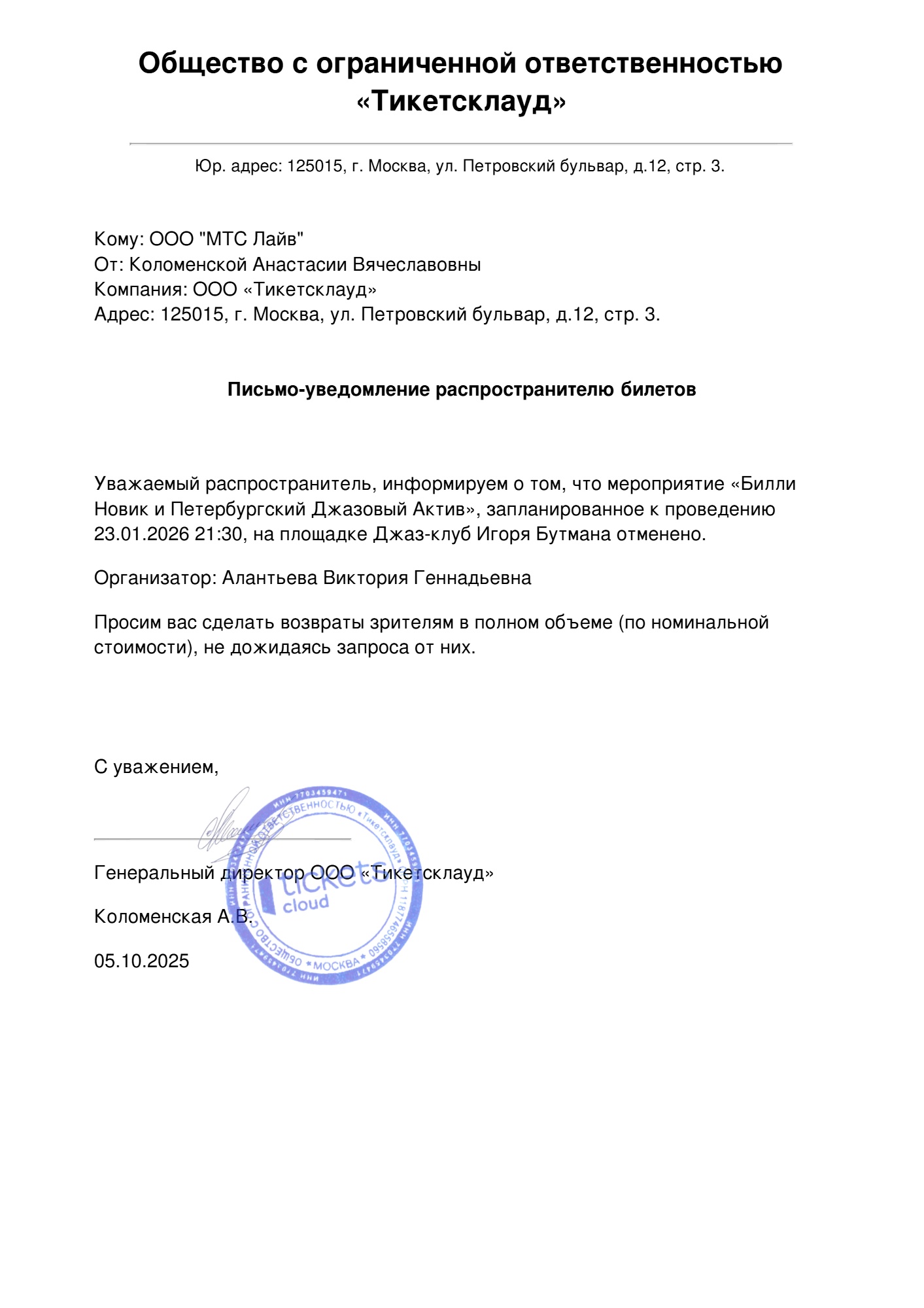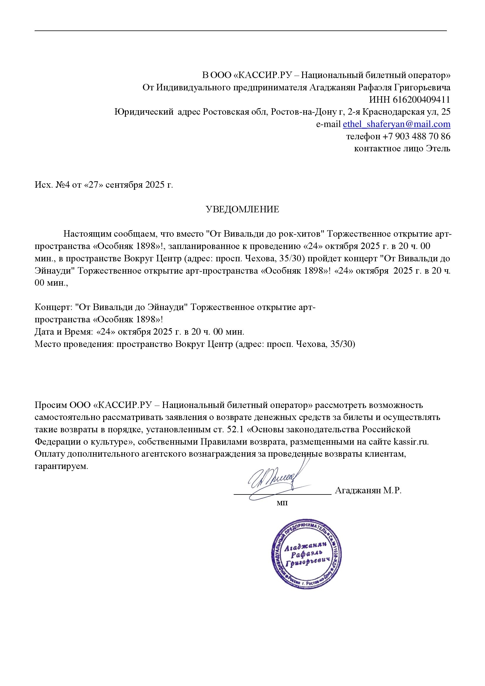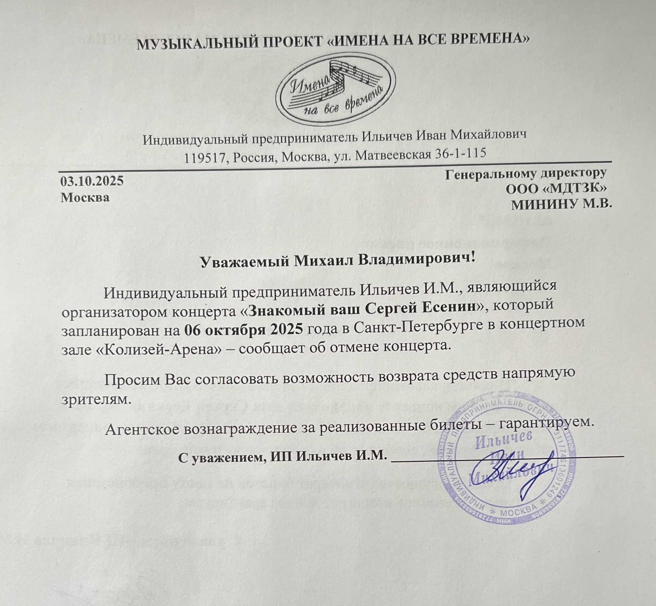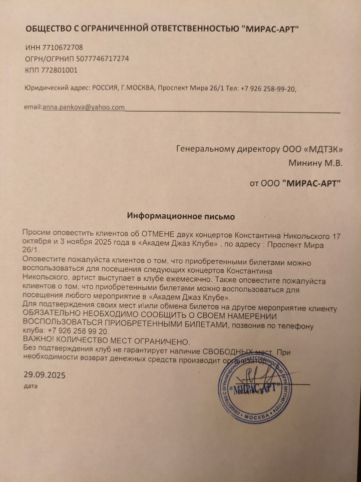Уважаемый клиент! Спешим сообщить, что по информации, полученной от организатора, Михаил Шахназаров. История в стиле FINE, запланированный на 12 октября 2025 года в 19:00 в Доме Печати, отменён. Деньги за электронные билеты вернутся автоматически в полном объёме на карту, с которой была произведена оплата. Если вы купили билет в кассе Ticketland.ru за наличный расчет, то обратитесь, пожалуйста, на почту: vozvrat@ticketland.ru. С уважением, команда поддержки Ticketland.