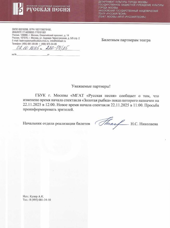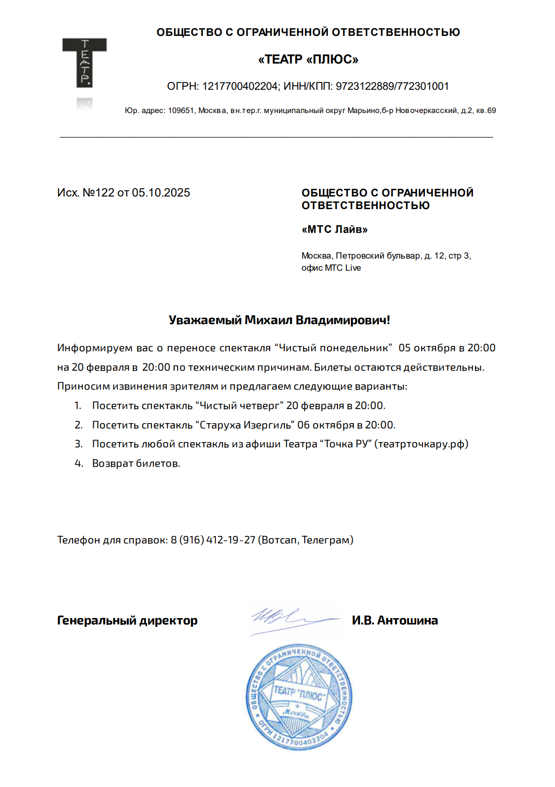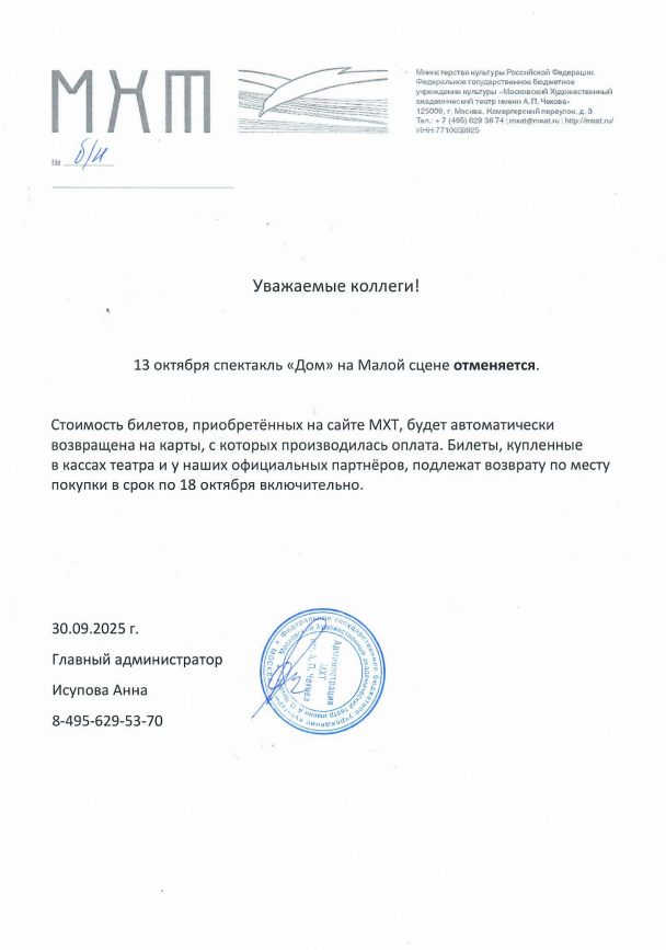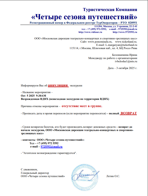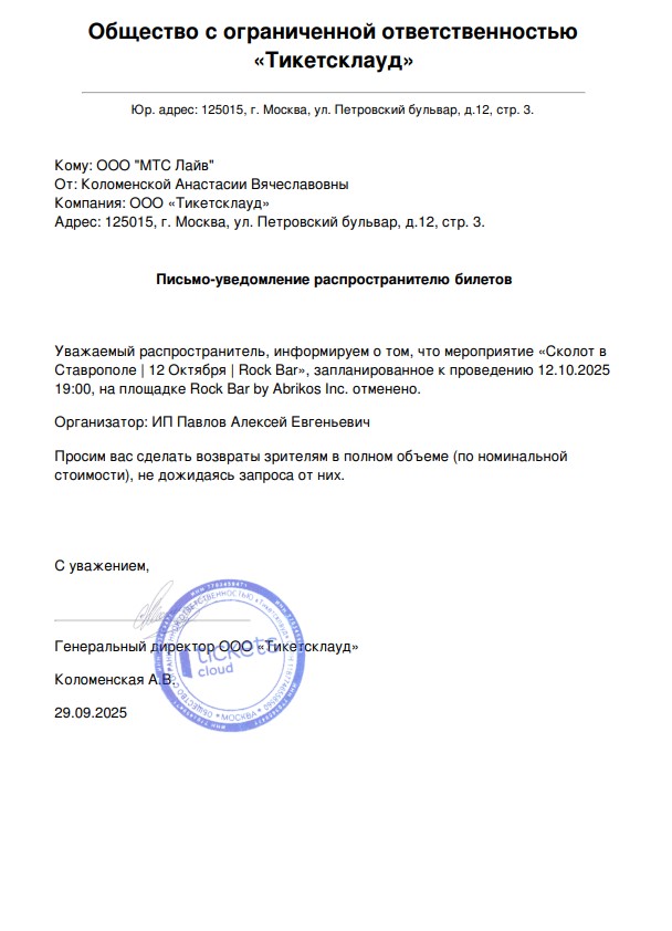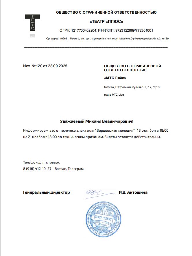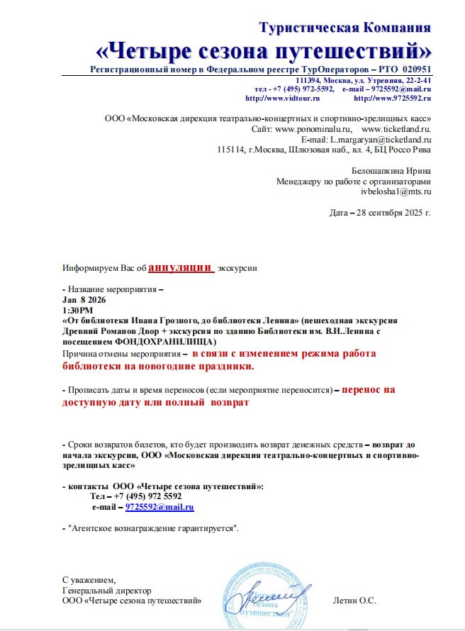 Уважаемый клиент! Спешим сообщить, что по информации, полученной от организатора, вечерняя театрализованная экскурсия «Тайны Остоженки» с фонарщиком Фаролеро, запланированная на 10 октября 2025 года в 19:30, отменена. Деньги за электронные билеты вернутся автоматически в полном объёме на карту, с которой была произведена оплата. Если вы купили билет в кассе Ticketland.ru за наличный расчет, то обратитесь, пожалуйста, на почту: vozvrat@ticketnd.ru. С уважением, команда поддержки Ticketland