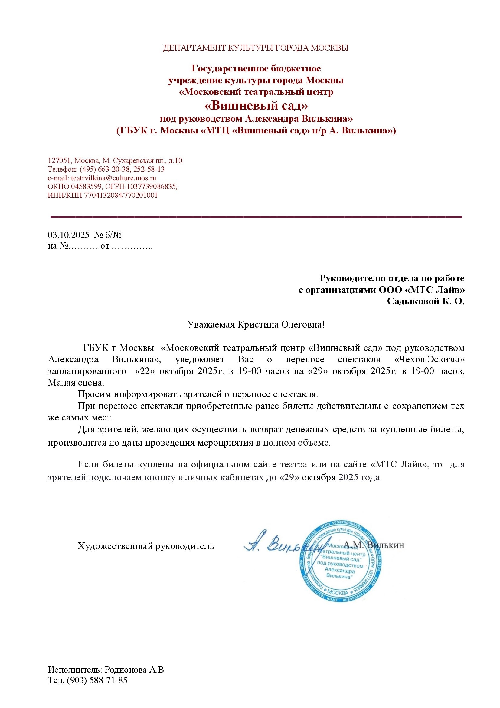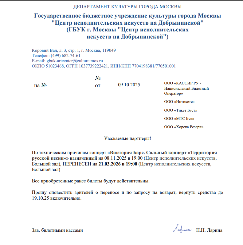 Уважаемый клиент! Спешим сообщить, что по информации, полученной от организатора, сольный концерт Виктории Барс «Территория русской песни», запланированный на 08.11.2025 в 19:00 в Центре исполнительских искусств, перенесён на 21.03.2026 в 19:00. Ранее приобретенные билеты действительны на новую дату, обменивать их не нужно. Если вам не удобно посетить спектакль в новую дату, вы можете вернуть билет по кнопке в личном кабинете во вкладке «Заказы» (до 19.10.25 включительно). Деньги за электронные билеты вернутся автоматически в полном объёме на карту, с которой была произведена оплата. Если вы купили билет в кассе Ticketland.ru за наличный расчет, то обратитесь, пожалуйста, на почту: vozvrat@ticketland.ru. С уважением, команда поддержки Ticketland.