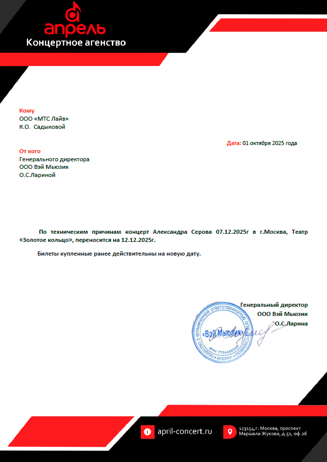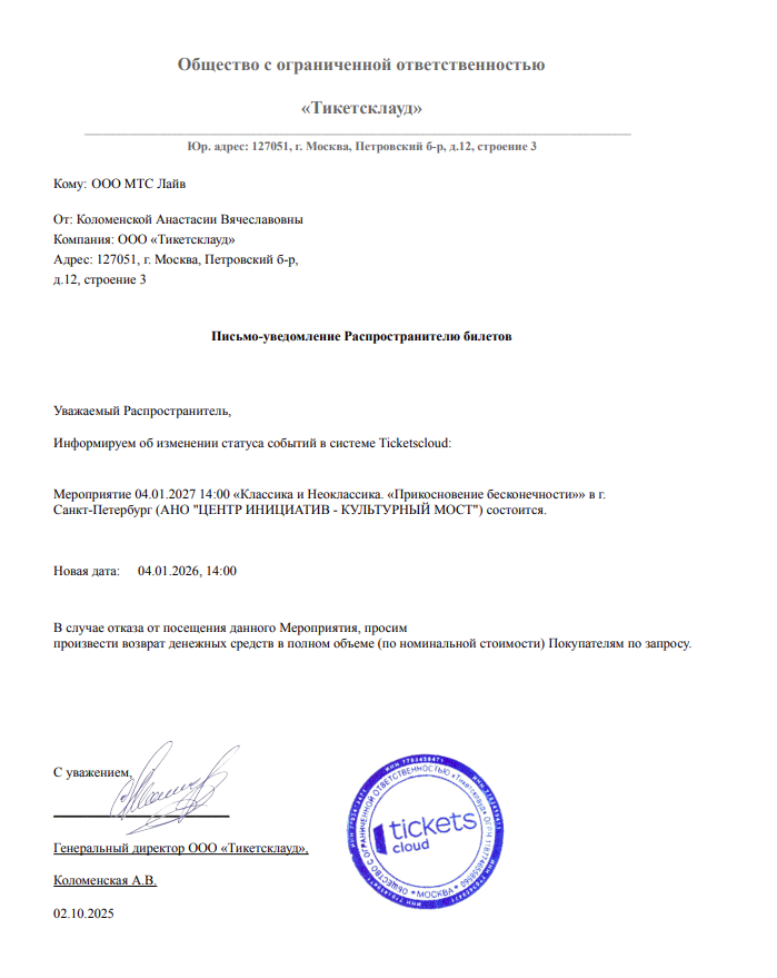 Уважаемый клиент! Спешим сообщить, что по информации, полученной от организатора, концерт «Шедевры мировой оперы. Ко Дню рождения Марии Каллас. Солистка Анна Аглатова», запланированный на 4 декабря 2025 года в 19:00 в Московской консерватории, перенесен на 5 декабря 2025 года в 19:00. Ранее приобретенные билеты действительны, обменивать их не нужно. Если вас не устраивает новая программа концерта, вернуть билет можно по кнопке в личном кабинете во вкладке «Заказы». Деньги за электронные билеты вернутся автоматически в полном объёме на карту, с которой была произведена оплата. Если вы купили билет в кассе Ticketland.ru за наличный расчет, то обратитесь, пожалуйста, на почту: vozvrat@ticketland.ru. С уважением, команда поддержки Ticketland