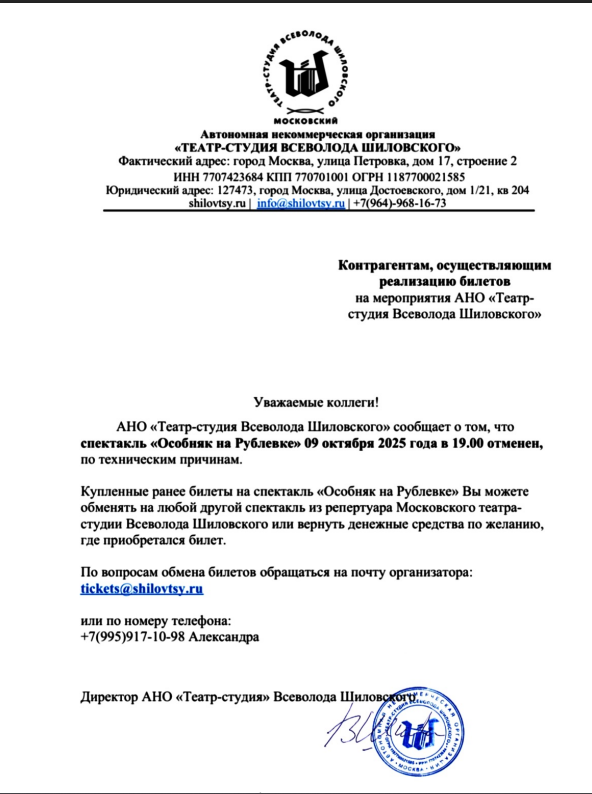Уважаемый клиент! Спешим сообщить, что по информации, полученной от организатора, спектакль «Особняк на Рублевке», запланированный на 09 октября 2025 года в 19.00 в Московском театр-студии Всеволода Шиловского, отменён. Купленные ранее билеты на спектакль «Особняк на Рублевке» Вы можетеобменять на любой другой спектакль из репертуара Московского театра-студии Всеволода Шиловского или вернуть денежные средства по желанию,где приобретался билет.По вопросам обмена билетов обращаться на почту организатора:tickets@shilovtsy.ruили по номеру телефона:+7(995)917-10-98 Александра. С уважением, команда поддержки Ticketland.