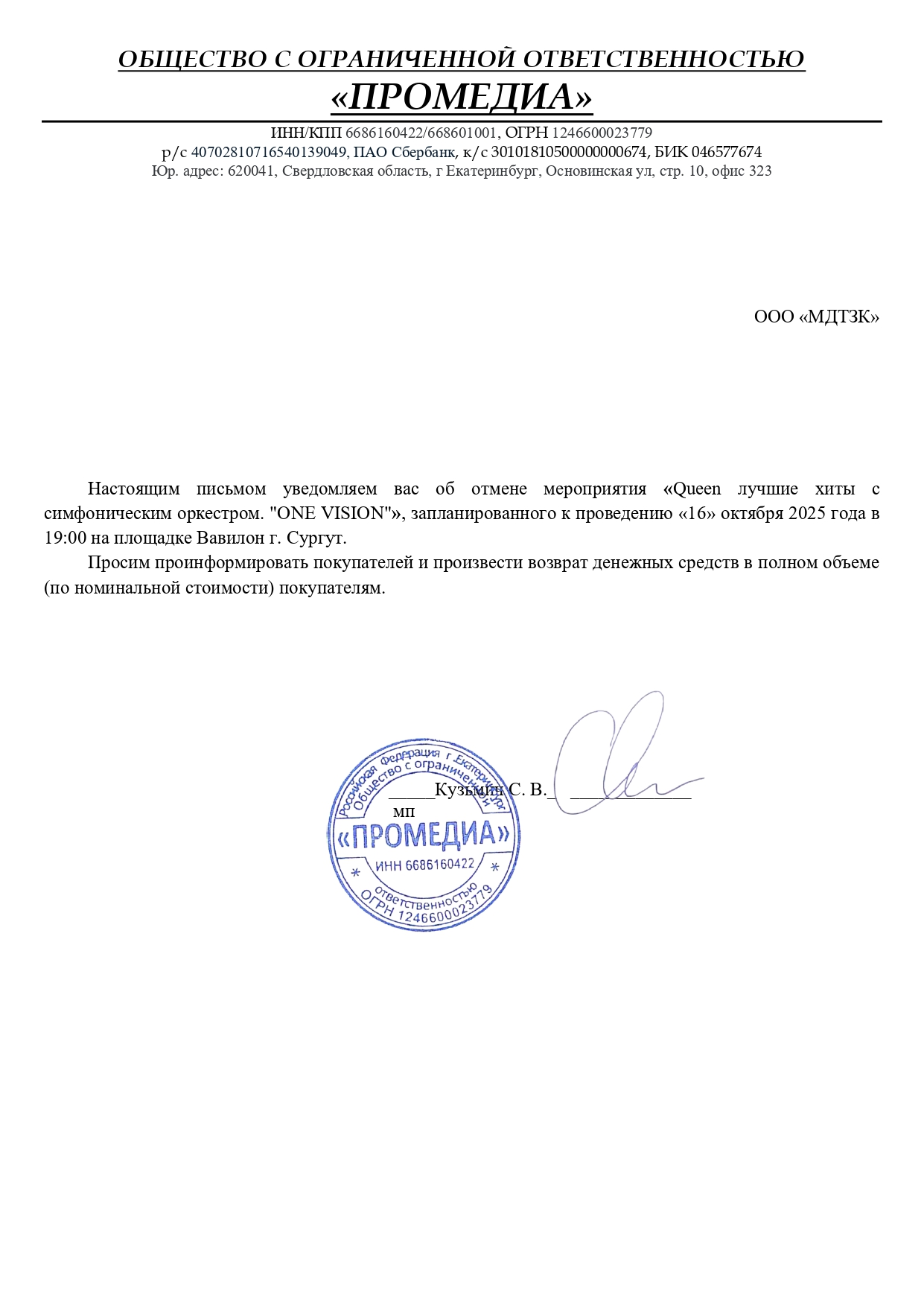 Уважаемый клиент! Спешим сообщить, что по информации, полученной от организатора, концерт «Queen лучшие хиты c оркестром.«ONE VISION», запланированный на 19 февраля 2025 года в 19:00 в ДК Родина, перенесен на 7 января 2026 года. Ранее приобретенные билеты действительны на новую дату, обменивать их не нужно. Если вам не удобно посетить мероприятие в новую дату, вы можете вернуть билет по кнопке в личном кабинете во вкладке «Заказы». Деньги за электронные билеты вернутся автоматически в полном объёме на карту, с которой была произведена оплата. Если вы купили билет в кассе Ticketland.ru за наличный расчет, то обратитесь, пожалуйста, на почту: vozvrat@ticketland.ru. С уважением, команда поддержки Ticketland