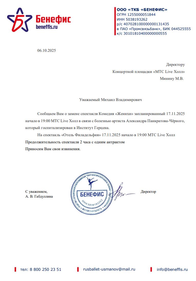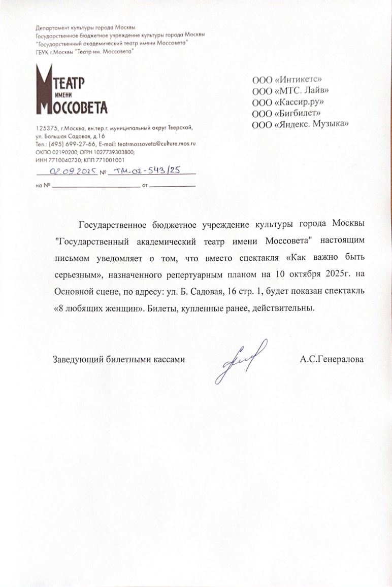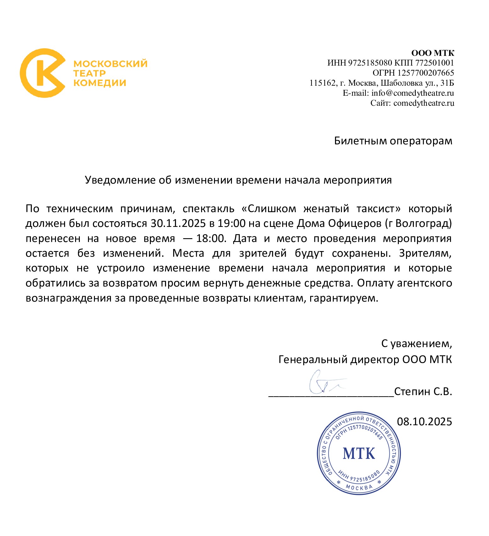 Уважаемый клиент! Спешим сообщить, что по информации, полученной от организатора, спектакль «Женихи», запланированный на2025-10-07 в 19:00 в Доме культуры «Октябрь», отменён. Деньги за электронные билеты вернутся автоматически в полном объёме на карту, с которой была произведена оплата. Если вы купили билет в кассе Ticketland.ru за наличный расчет, то обратитесь, пожалуйста, на почту: vozvrat@ticketland.ru. С уважением, команда поддержки Ticketland.