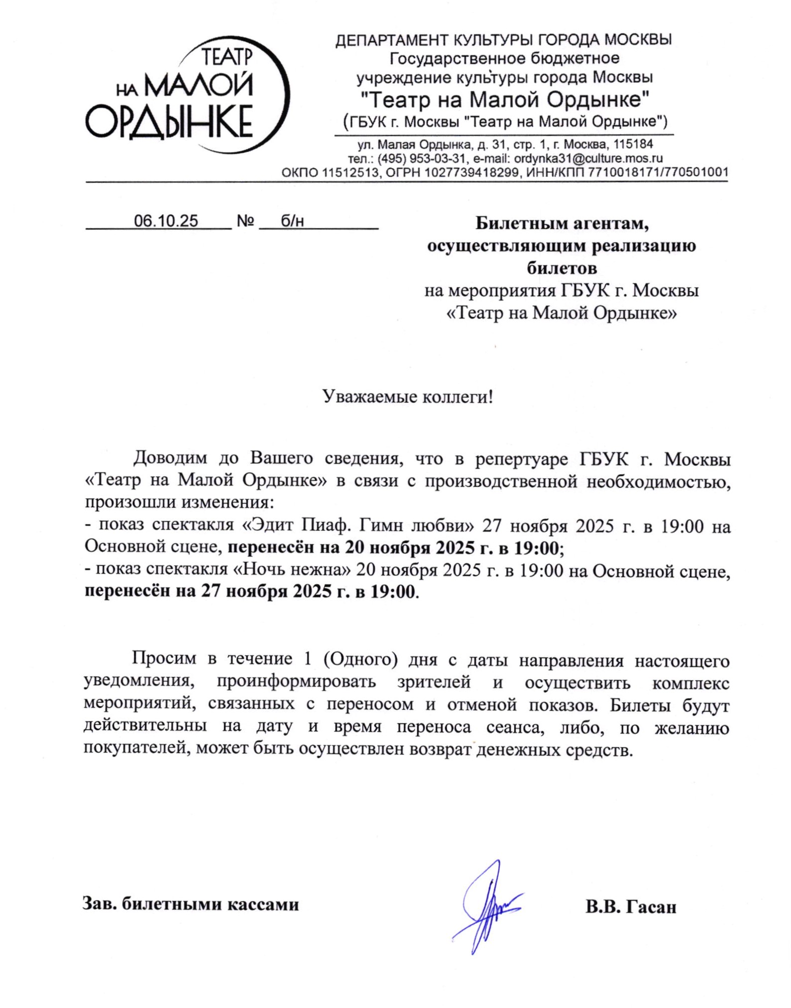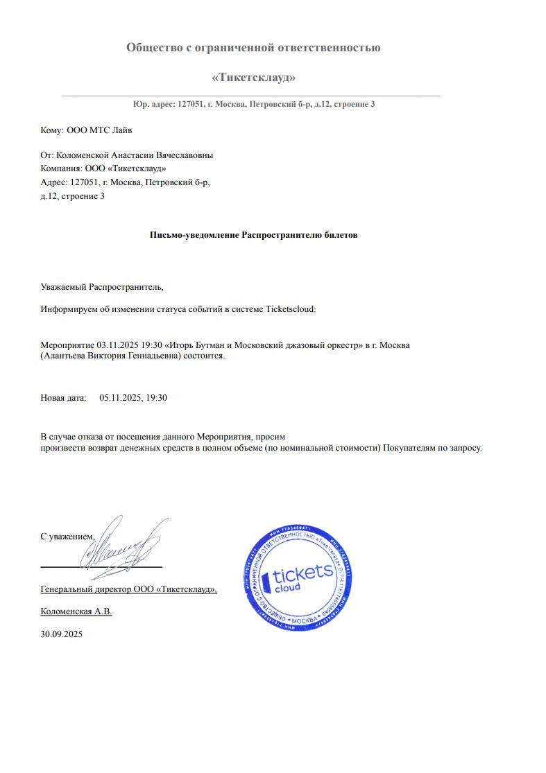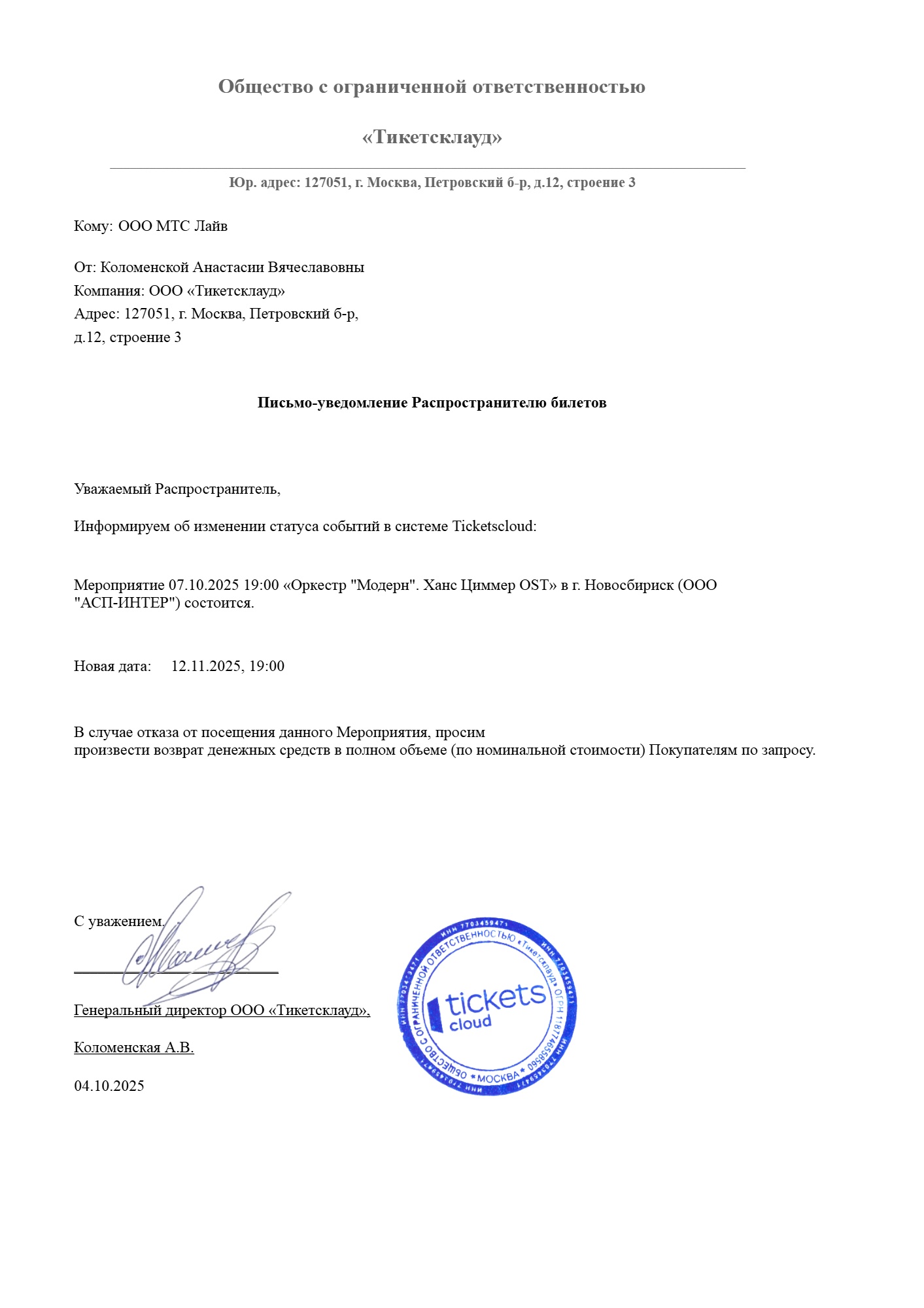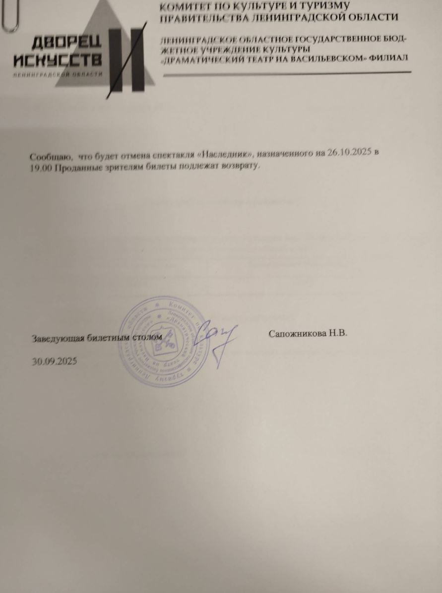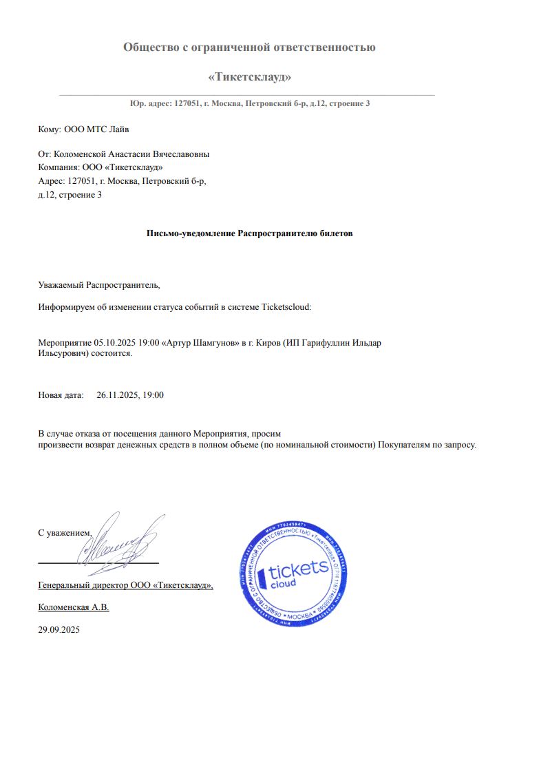 Уважаемый клиент! Спешим сообщить, что по информации, полученной от организатора, спектакль «Любовь не умирает», запланированный на 28 ноября 2025 года в 19:00 в БКЗ «Космос», перенесён на 29 ноября 2025 года, начало в 19:00. Ранее приобретенные билеты действительны на новую дату, обменивать их не нужно. Если вам не удобно посетить спектакль в новую дату, вы можете вернуть билет по кнопке в личном кабинете во вкладке «Заказы». Деньги за электронные билеты вернутся автоматически в полном объёме на карту, с которой была произведена оплата. Если вы купили билет в кассе Ticketland.ru за наличный расчет, то обратитесь, пожалуйста, на почту: vozvrat@ticketland.ru. С уважением, команда поддержки Ticketland.