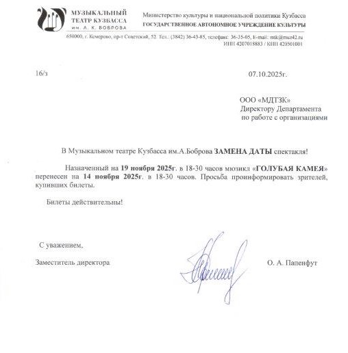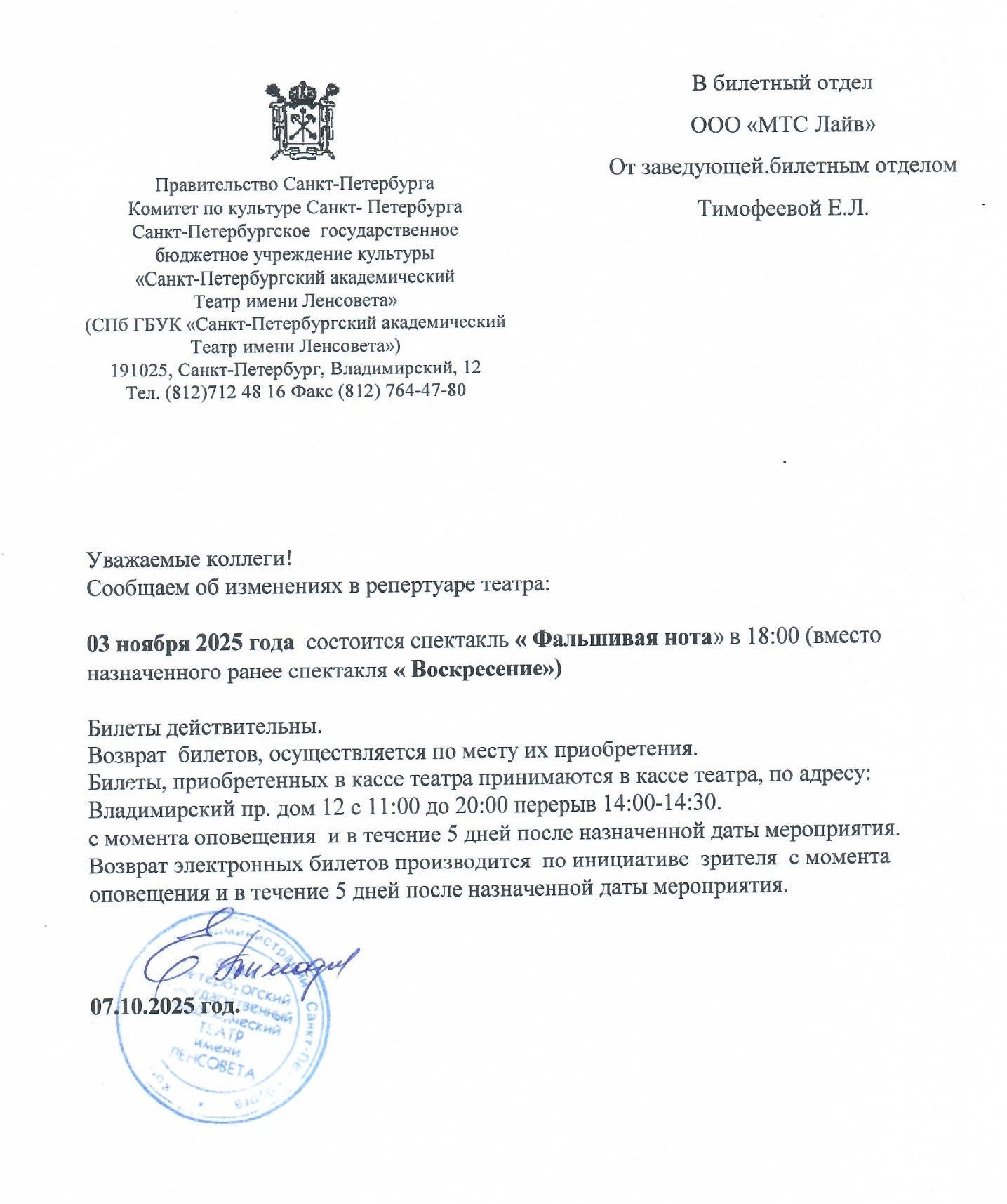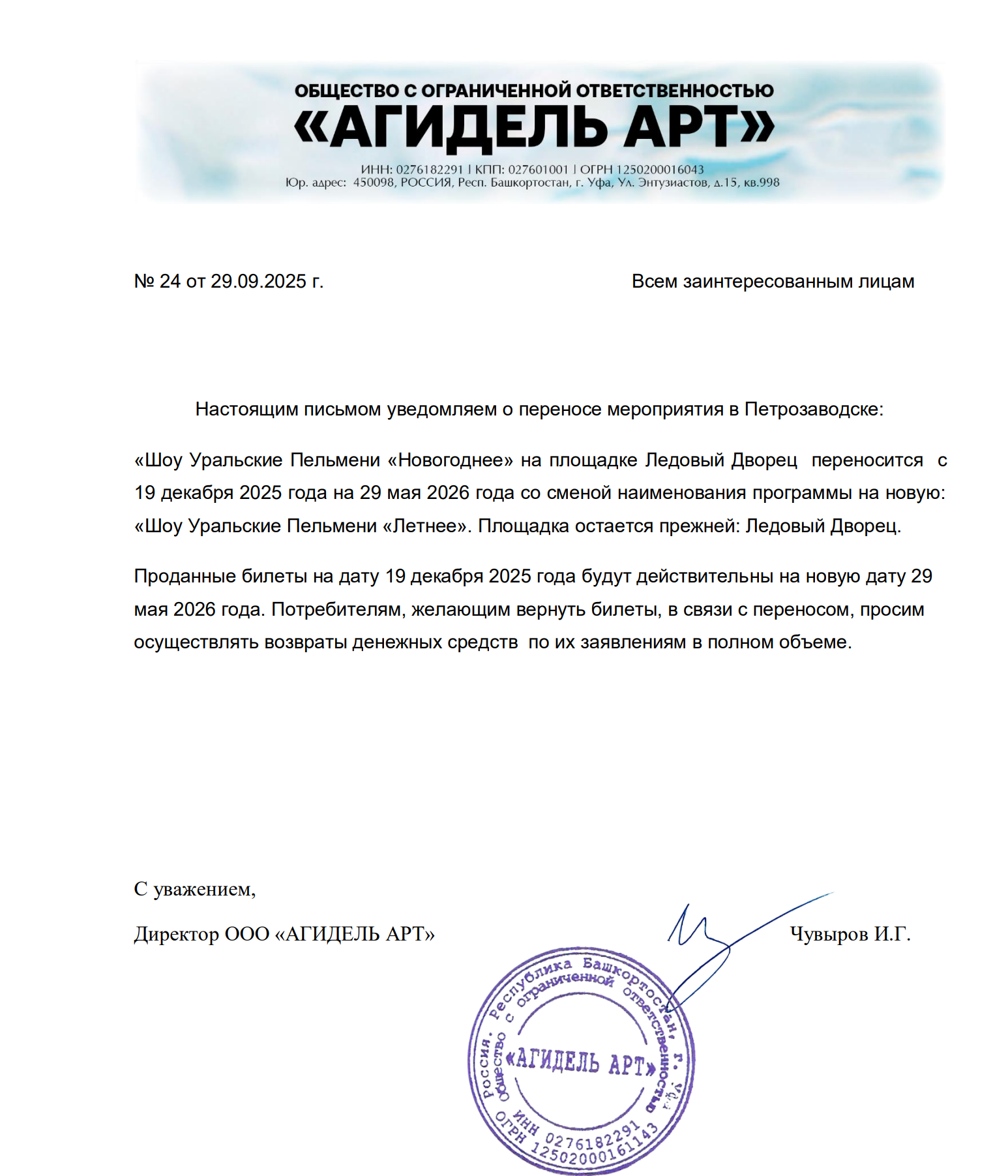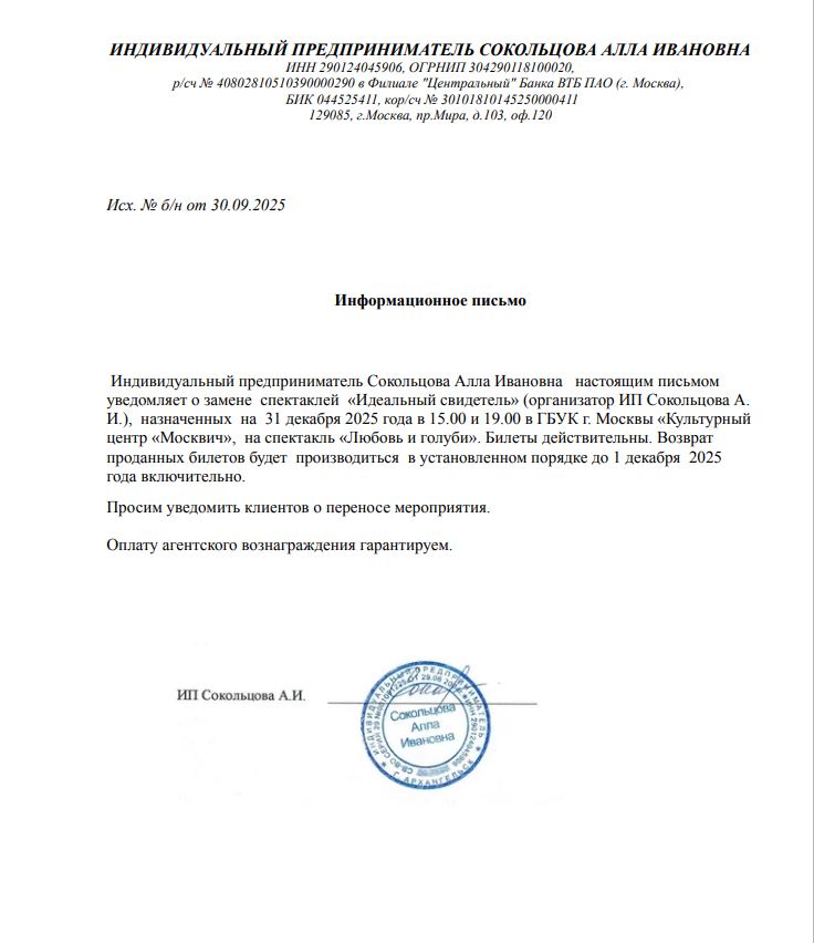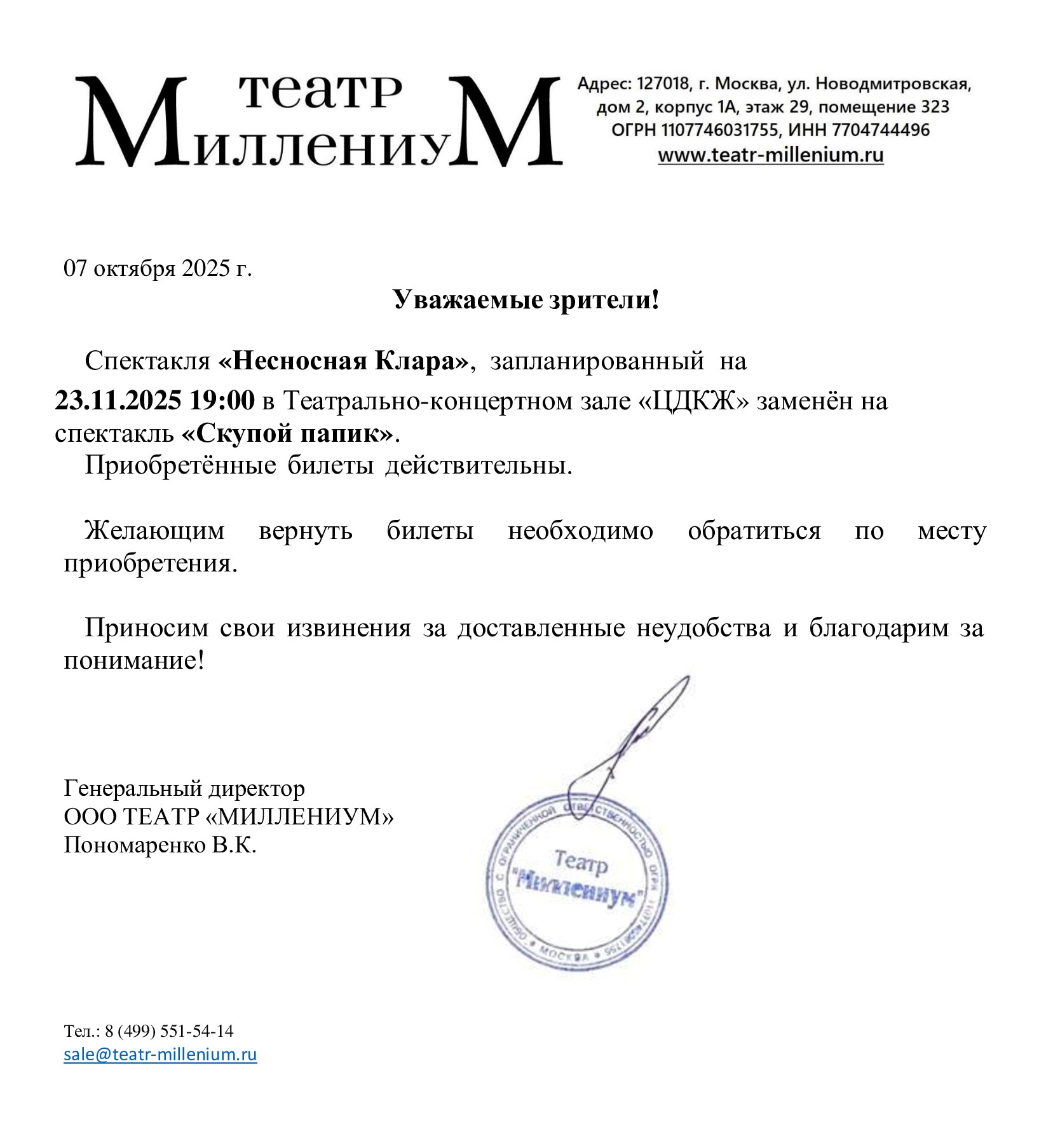 Уважаемый клиент! Спешим сообщить, что по информации, полученной от организатора, спектакль «Любовь не умирает», запланированный на 28 ноября 2025 года в 19:00 в БКЗ «Космос», перенесён на 29 ноября 2025 года, начало в 19:00. Ранее приобретенные билеты действительны на новую дату, обменивать их не нужно. Если вам не удобно посетить спектакль в новую дату, вы можете вернуть билет по кнопке в личном кабинете во вкладке «Заказы». Деньги за электронные билеты вернутся автоматически в полном объёме на карту, с которой была произведена оплата. Если вы купили билет в кассе Ticketland.ru за наличный расчет, то обратитесь, пожалуйста, на почту: vozvrat@ticketland.ru. С уважением, команда поддержки Ticketland.