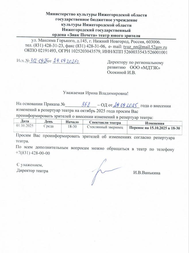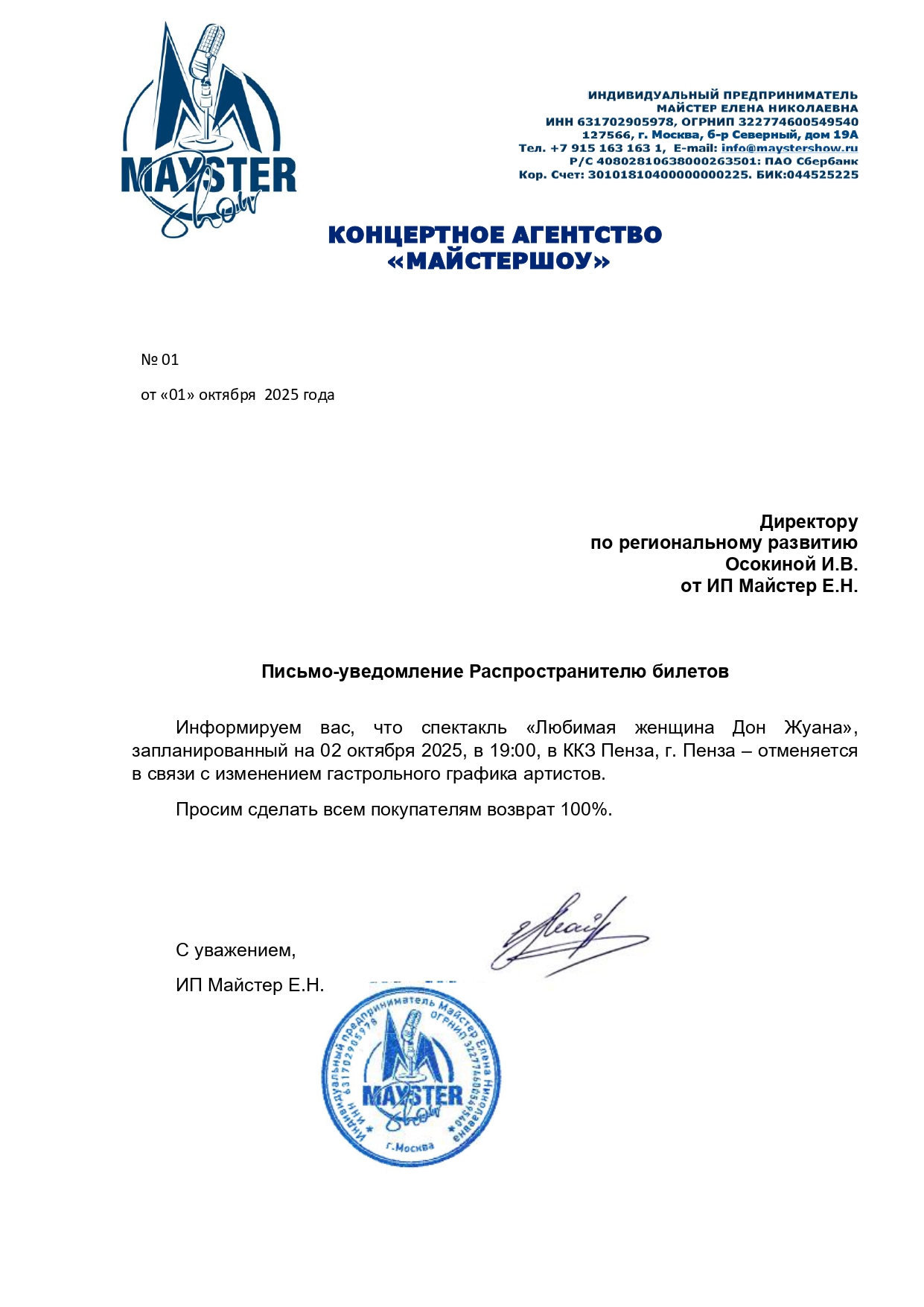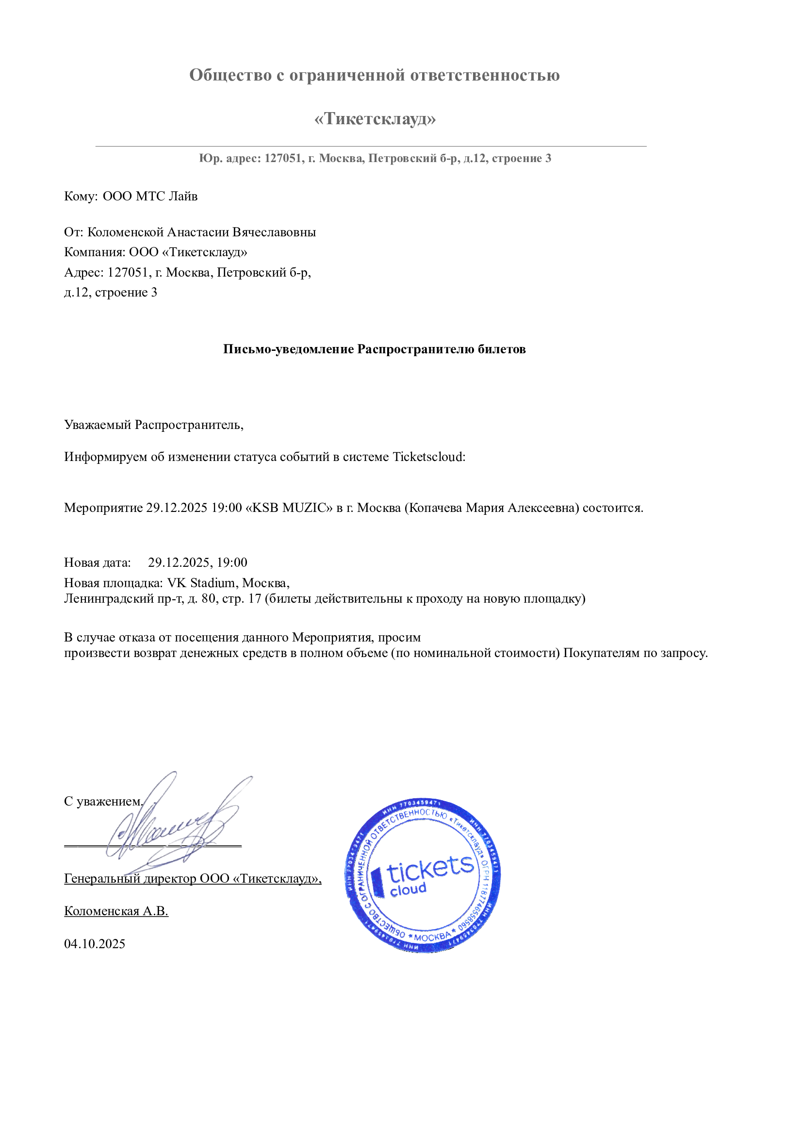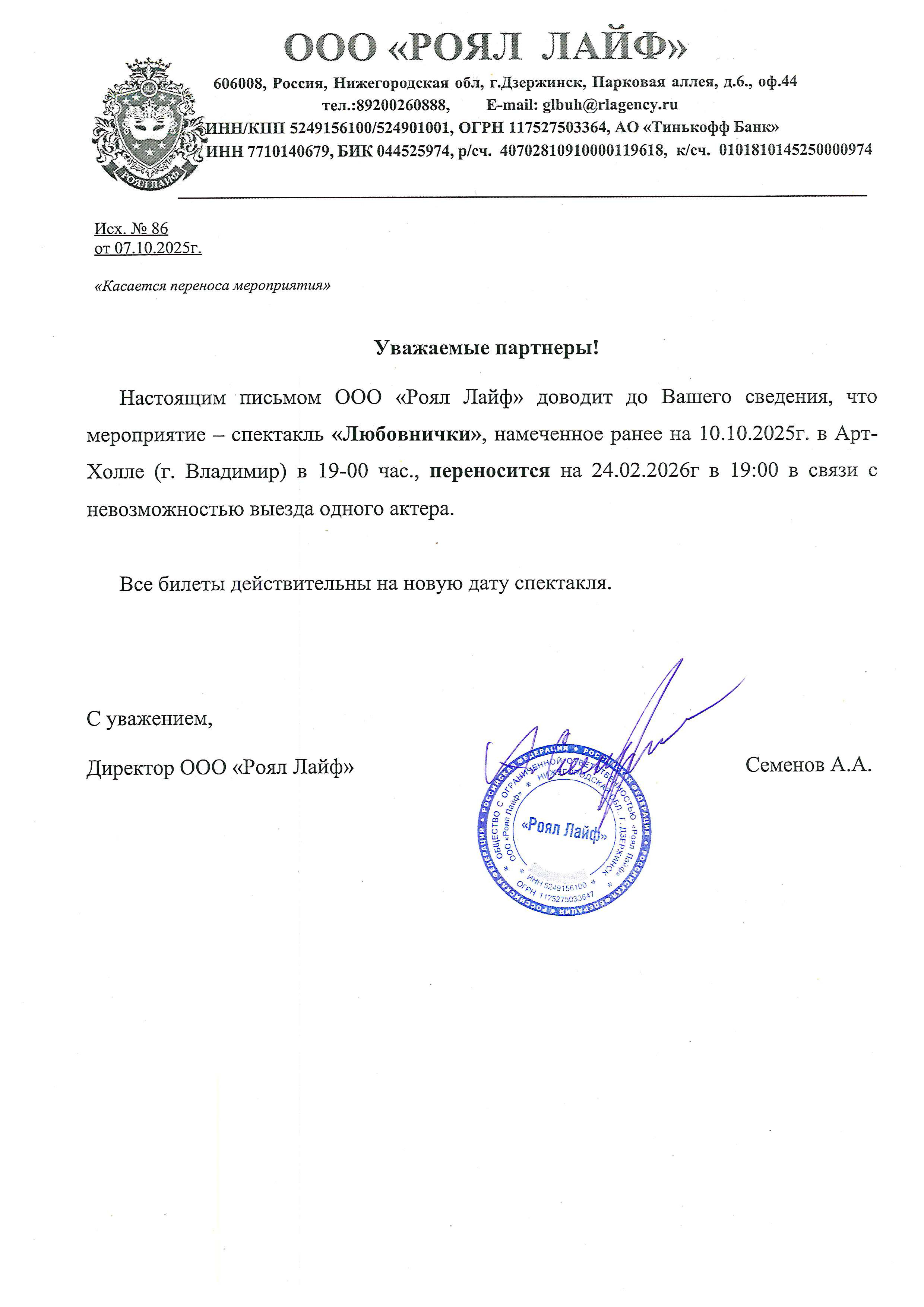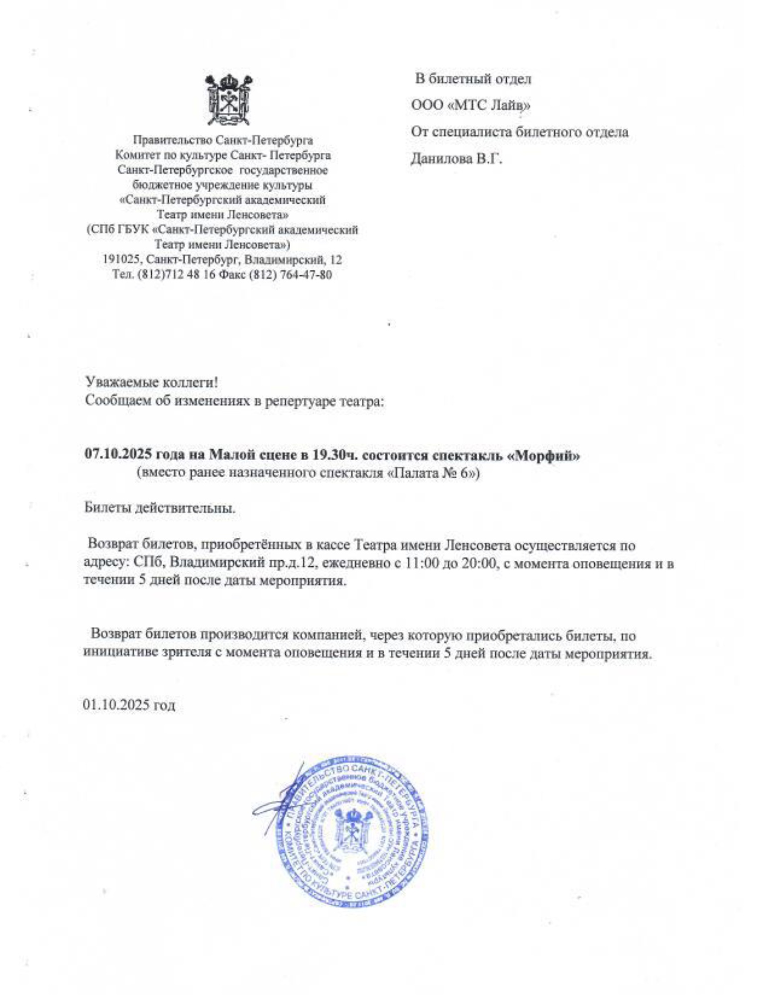 Уважаемый клиент! Спешим сообщить, что по информации, полученной от организатора, спектакль «Любовь не умирает», запланированный на 28 ноября 2025 года в 19:00 в БКЗ «Космос», перенесён на 29 ноября 2025 года, начало в 19:00. Ранее приобретенные билеты действительны на новую дату, обменивать их не нужно. Если вам не удобно посетить спектакль в новую дату, вы можете вернуть билет по кнопке в личном кабинете во вкладке «Заказы». Деньги за электронные билеты вернутся автоматически в полном объёме на карту, с которой была произведена оплата. Если вы купили билет в кассе Ticketland.ru за наличный расчет, то обратитесь, пожалуйста, на почту: vozvrat@ticketland.ru. С уважением, команда поддержки Ticketland.