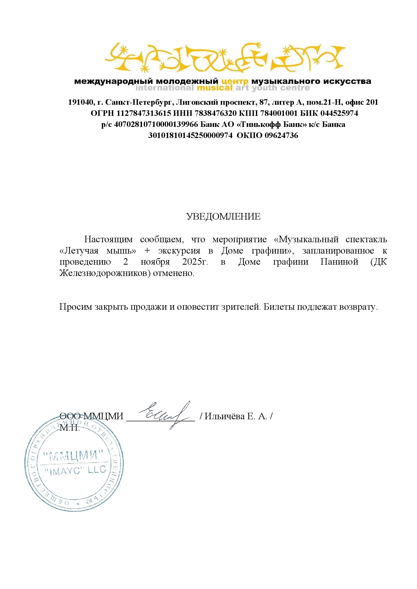 Уважаемый клиент! Спешим сообщить, что по информации, полученной от организатора, концерт во дворце «Рок-хиты на виолончелях. Atomic Cellos», запланированный на 11 октября 2025 года в 19:00 и 07 ноября 2025 года в 20:00 в доме журналиста, отменён. Деньги за электронные билеты вернутся автоматически в полном объёме на карту, с которой была произведена оплата. Если вы купили билет в кассе Ticketland.ru за наличный расчет, то обратитесь, пожалуйста, на почту: vozvrat@ticketland.ru. С уважением, команда поддержки Ticketland.