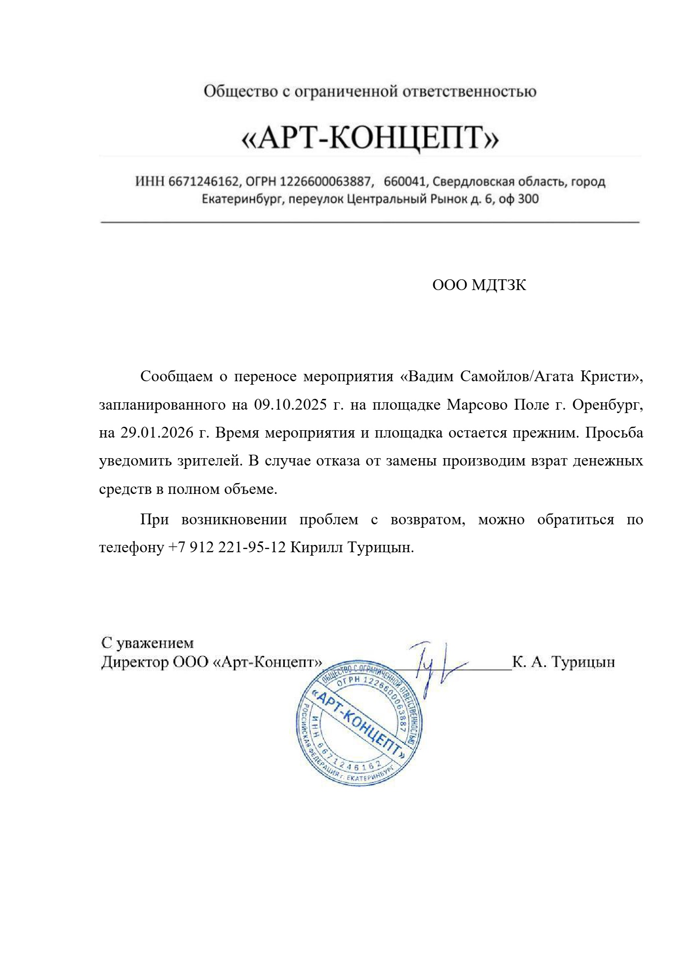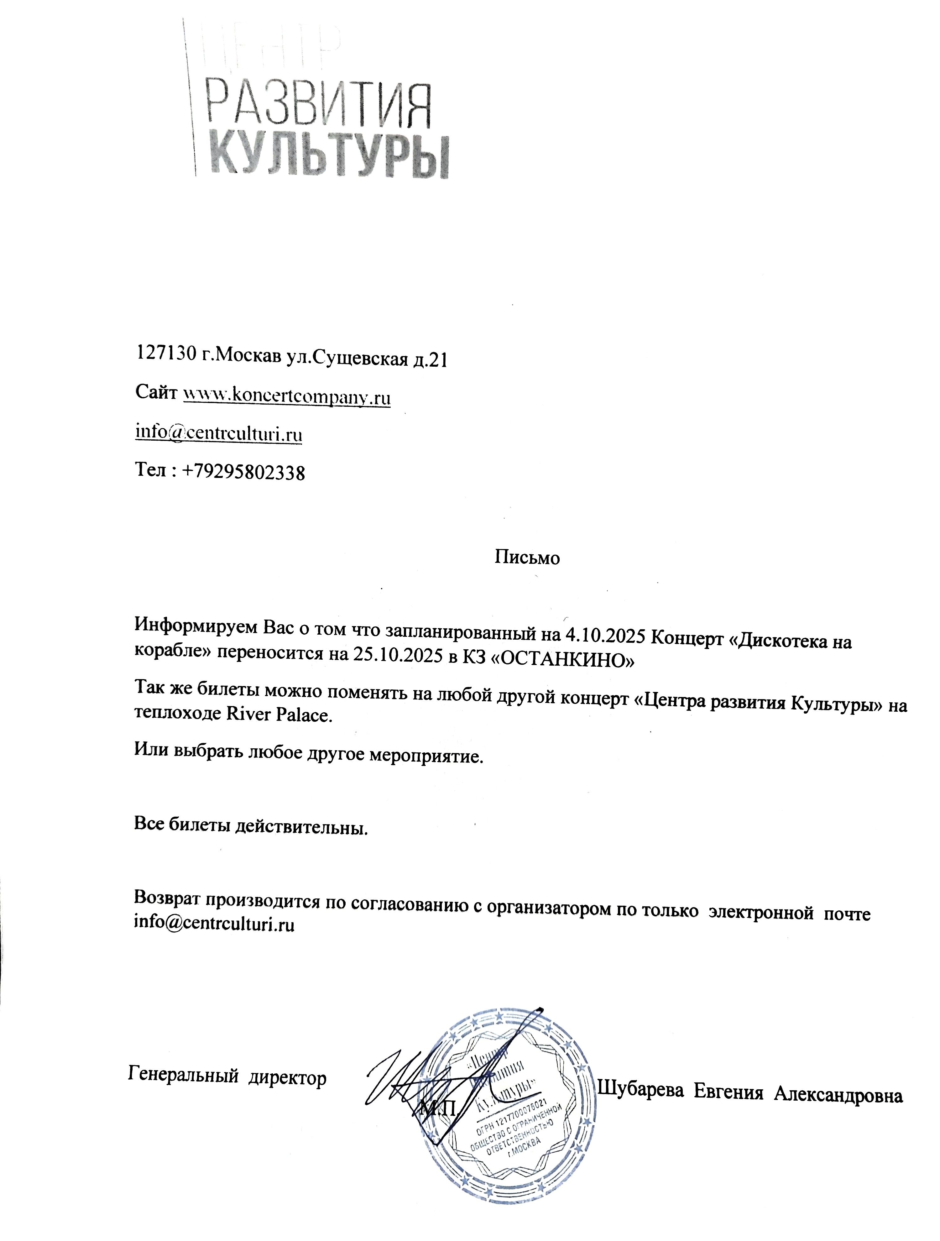 Уважаемый клиент! Спешим сообщить, что по информации, полученной от организатора, концерт группы «Сурганова и Оркестр», запланированный на 4 ноября 2024 года 19:00 в ДК «Россия», перенесен на 21 октября 2025 года. Ранее приобретенные билеты действительны, обменивать их не нужно. Если вы не хотите посетить новое мероприятие, вернуть билет можно по кнопке в личном кабинете во вкладке «Заказы» (до дня мероприятия). Деньги за электронные билеты вернутся автоматически в полном объёме на карту, с которой была произведена оплата. Если вы купили билет в кассе Ticketland.ru за наличный расчет, то обратитесь, пожалуйста, на почту: vozvrat@ticketland.ru. С уважением, команда поддержки Ticketland