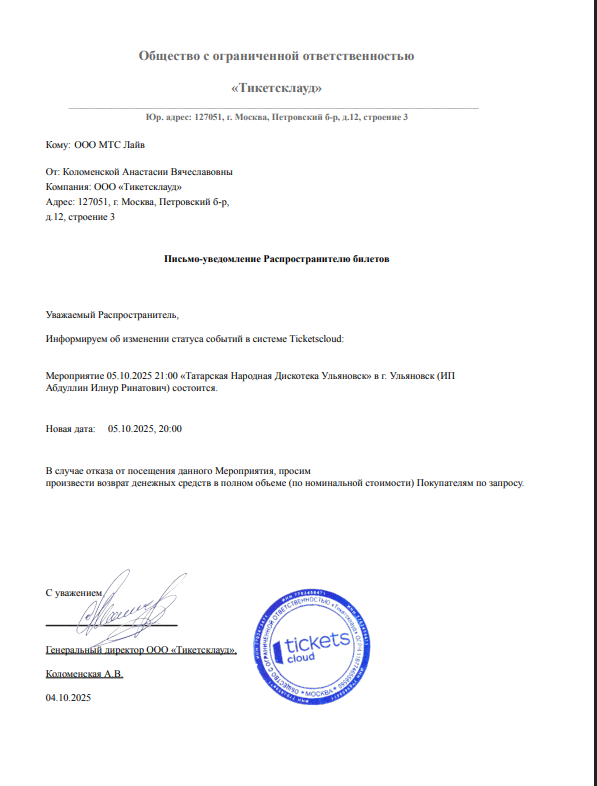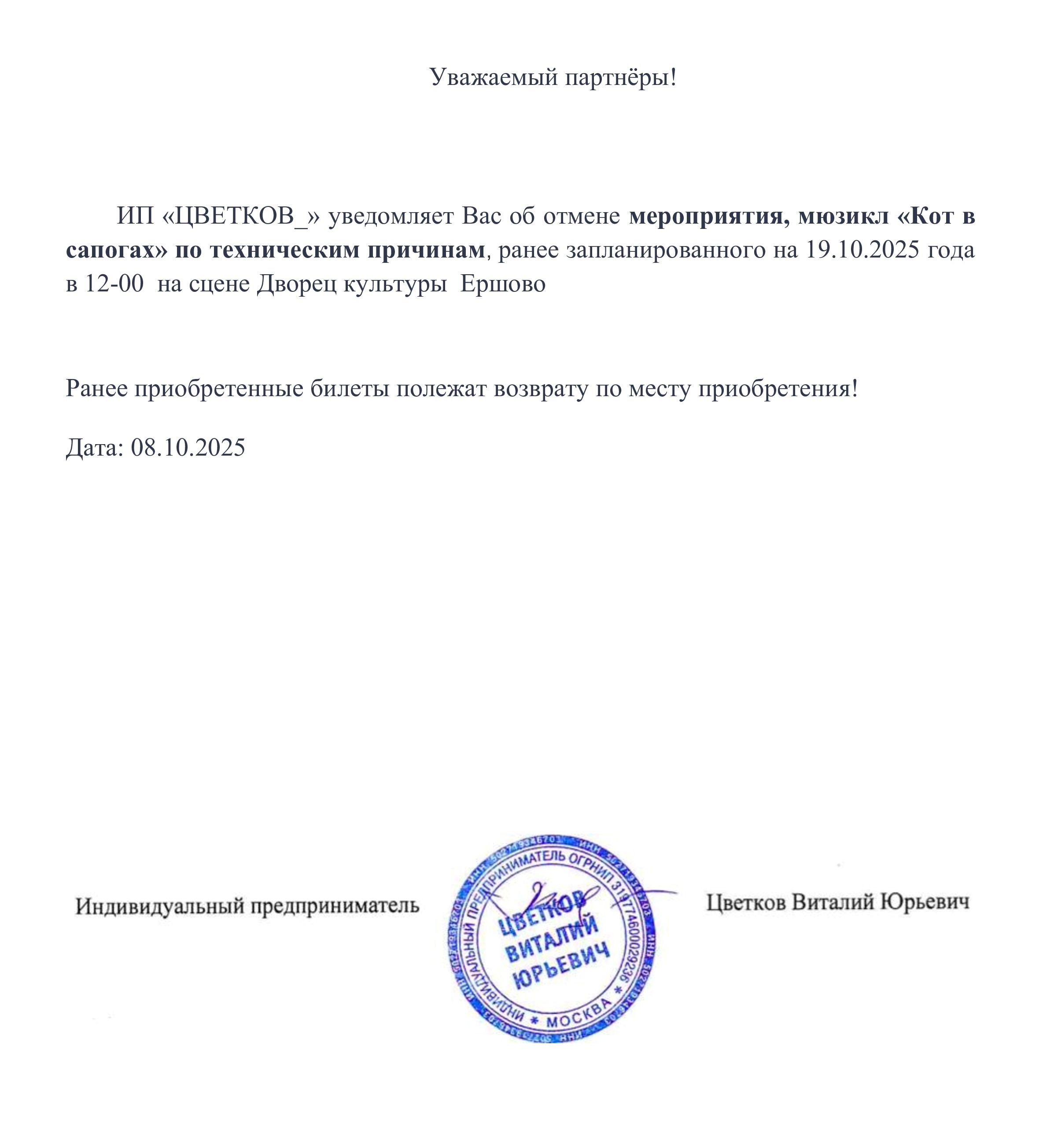 Уважаемый клиент! Спешим сообщить, что по информации, полученной от организатора, Мюзикл «Кот в сапогах», запланированный на 19 октября 2025 года в 12:00 ДК Ершово, отменён. Деньги за электронные билеты вернутся автоматически в полном объёме на карту, с которой была произведена оплата. Если вы купили билет в кассе Ticketland.ru за наличный расчет, то обратитесь, пожалуйста, на почту: vozvrat@ticketland.ru. С уважением, команда поддержки Ticketland.