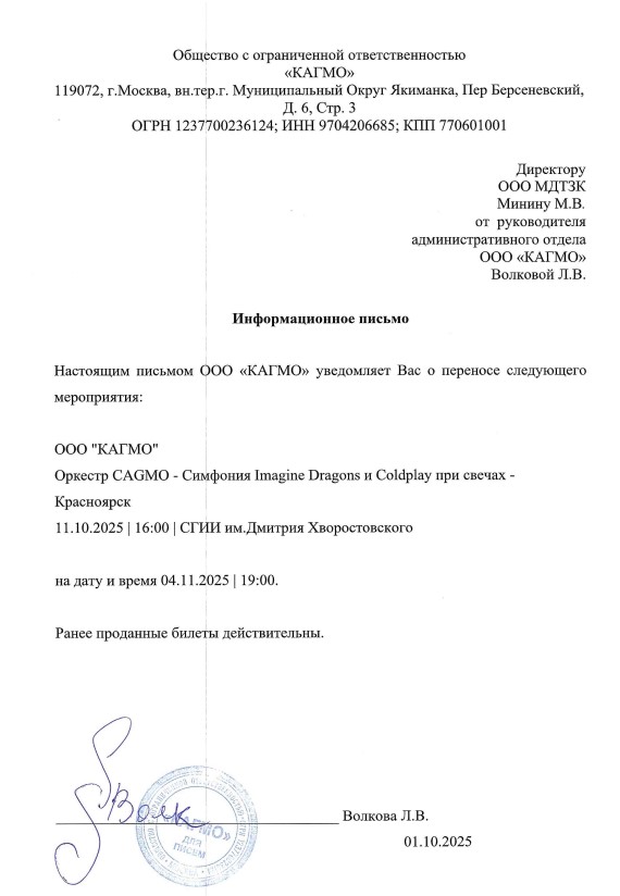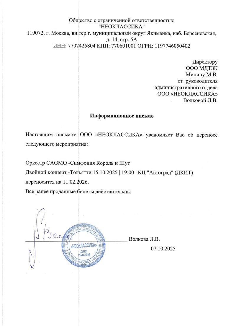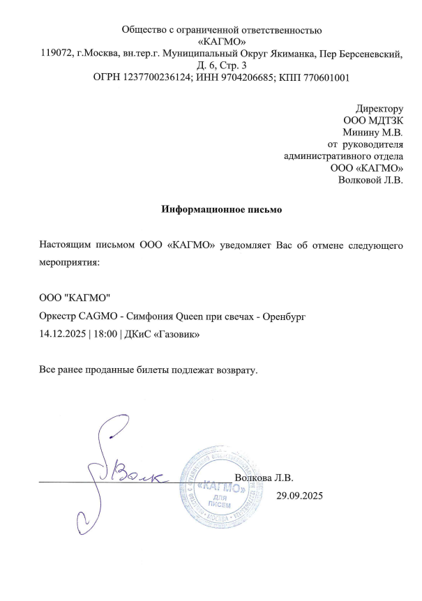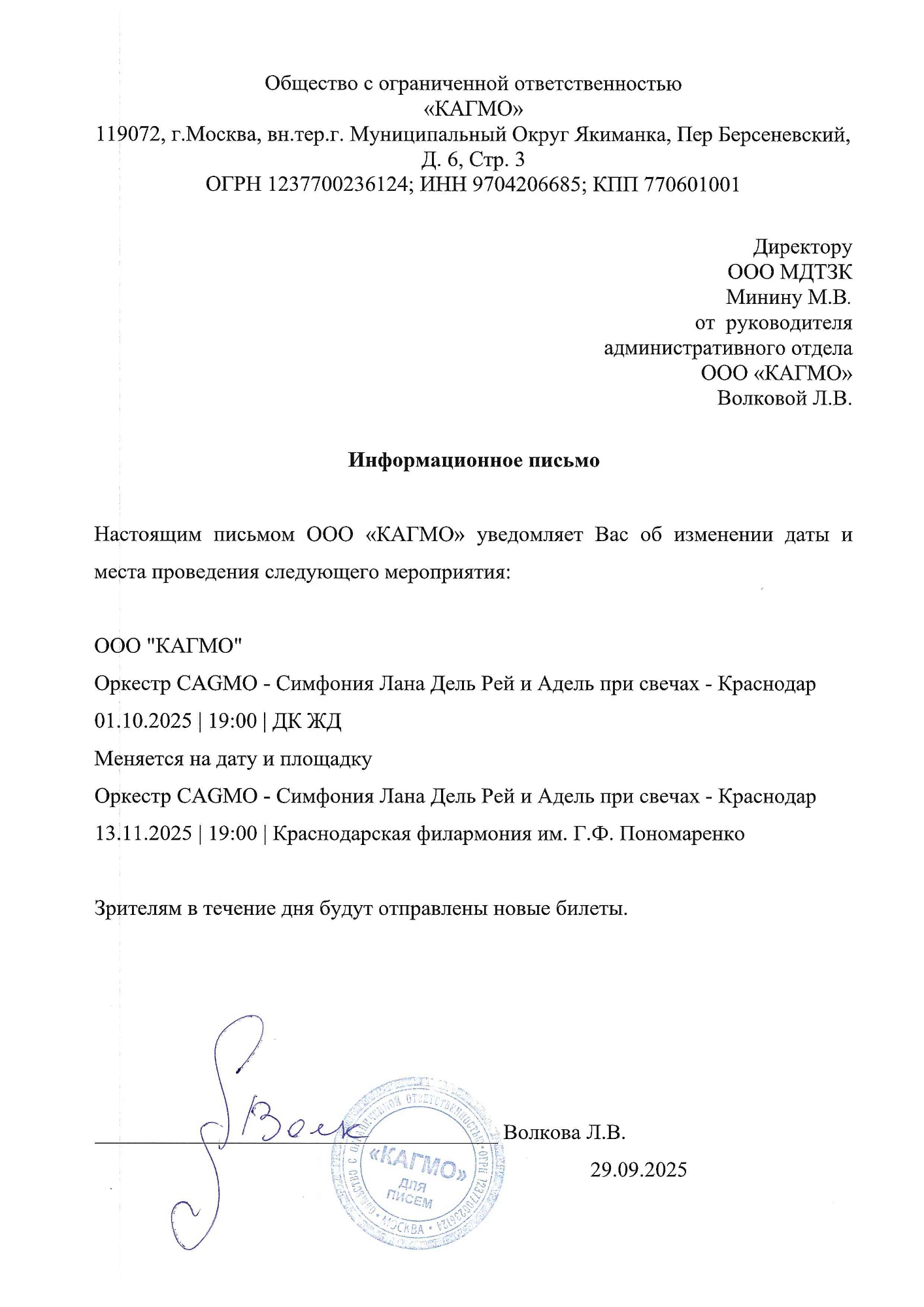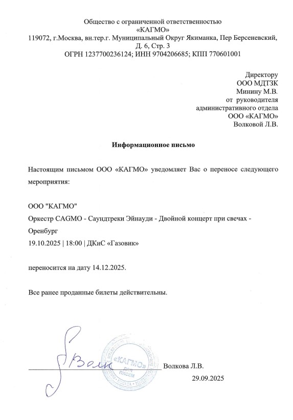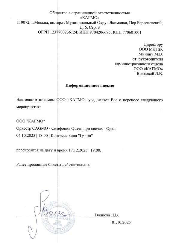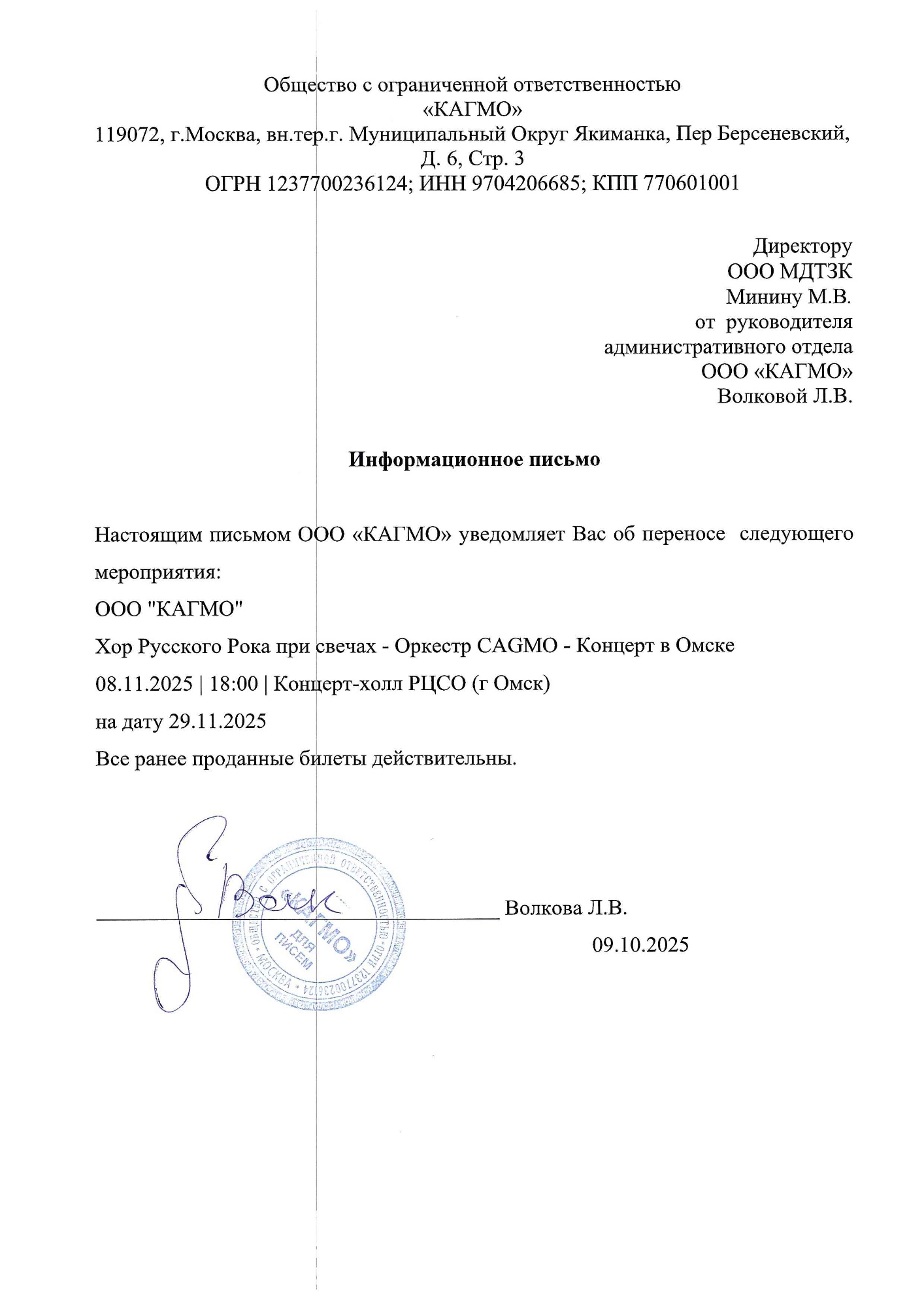 Уважаемый клиент! Спешим сообщить, что по информации, полученной от организатора, концерт «Оркестр CAGMO. Хор русского рока при свечах», запланированный на 8 ноября 2025 года в 18:00 в концерт-холле РЦСО, перенесён на 29 ноября 2025 года, начало в 18:00. Все ранее проданные билеты действительны. Условия возврата будут объявлены дополнительно. С уважением, команда поддержки Ticketland