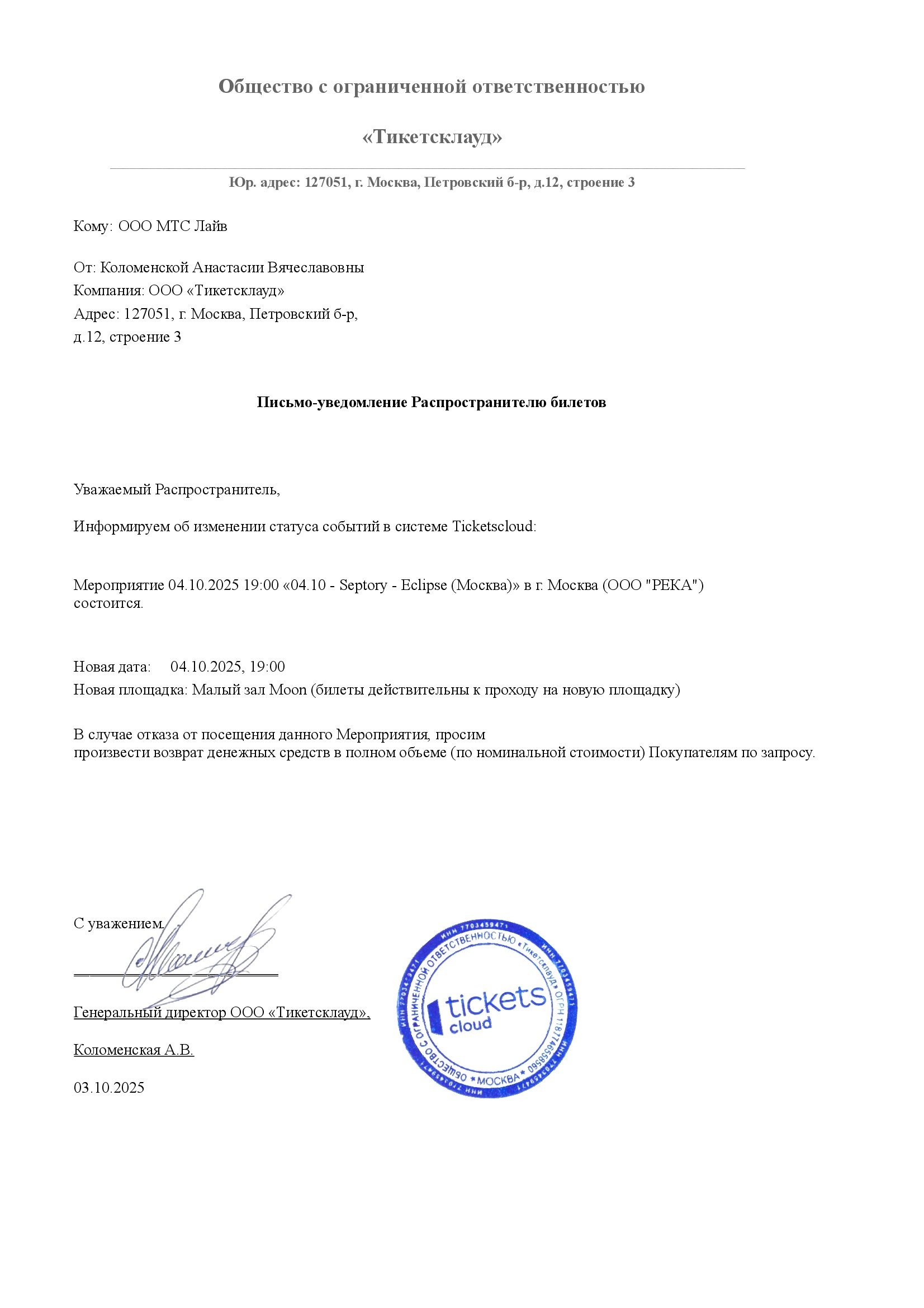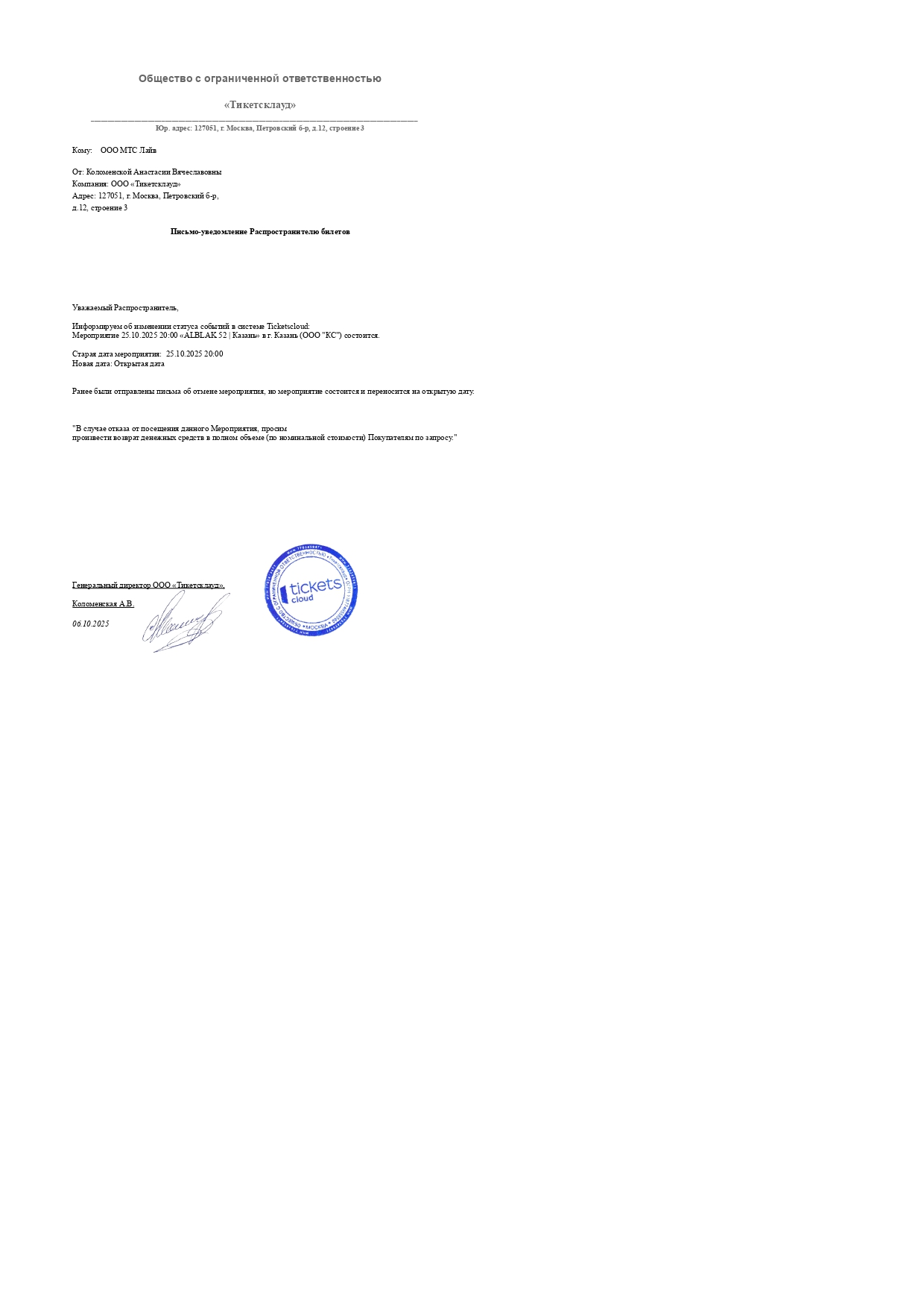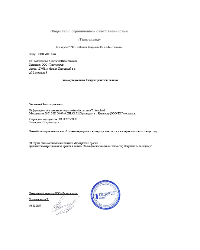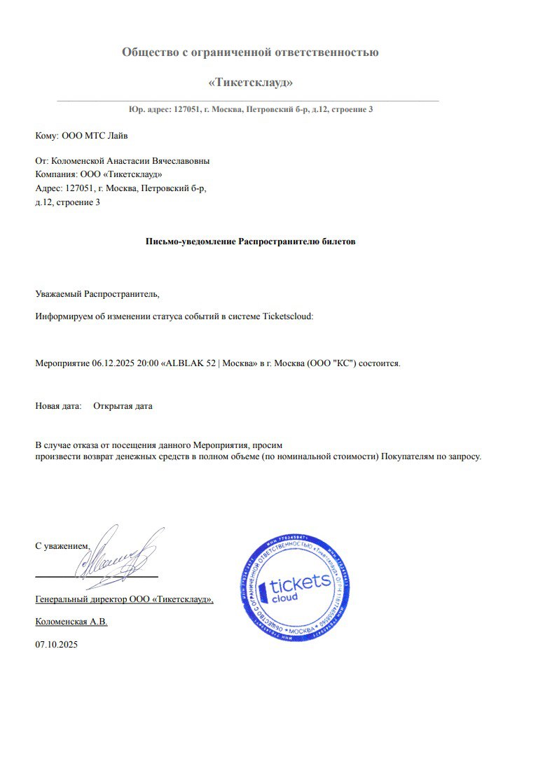 Уважаемый клиент! Спешим сообщить, что по информации, полученной от организатора, концерт TEKASHI 6IX9INE, запланированный на 19 октября 2024 года в 20:00 в МТС Live Холл, перенесен на открытую дату. О новой дате проведения концерта будет объявлено дополнительно. Ранее приобретенные билеты действительны, обменивать их не нужно. Если вы не хотите посетить новое мероприятие, вернуть билет можно по кнопке в личном кабинете во вкладке «Заказы» (до 31 октября 2024 года включительно). Деньги за электронные билеты вернутся автоматически в полном объёме на карту, с которой была произведена оплата. Если вы купили билет в кассе Ticketland.ru за наличный расчет, то обратитесь, пожалуйста, на почту: vozvrat@ticketland.ru. С уважением, команда поддержки Ticketland.