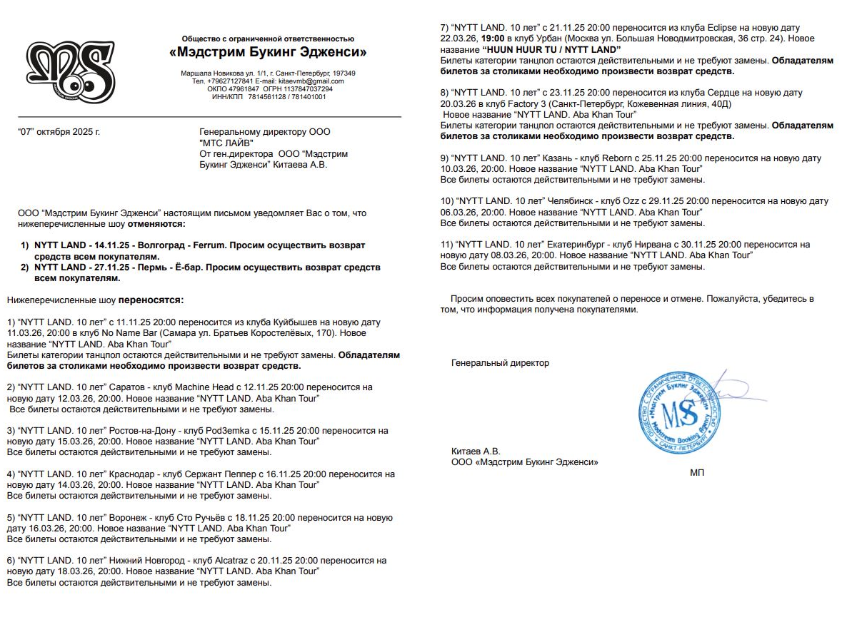 Уважаемый клиент! Спешим сообщить, что по информации, полученной от организатора, концерт «Nytt Land. 10 лет», запланированный на 12 ноября 2025 года в клубе «Machine Head», перенесен на 12 марта 2026 года. Новое название «NYTT LAND. Aba Khan Tour» Если вам не удобно посетить мероприятие в новую дату, вы можете вернуть билет по кнопке в личном кабинете во вкладке «Заказы». Деньги за электронные билеты вернутся автоматически в полном объёме на карту, с которой была произведена оплата. Если вы купили билет в кассе Ticketland.ru за наличный расчет, то обратитесь, пожалуйста, на почту: vozvrat@ticketland.ru. С уважением, команда поддержки Ticketland
