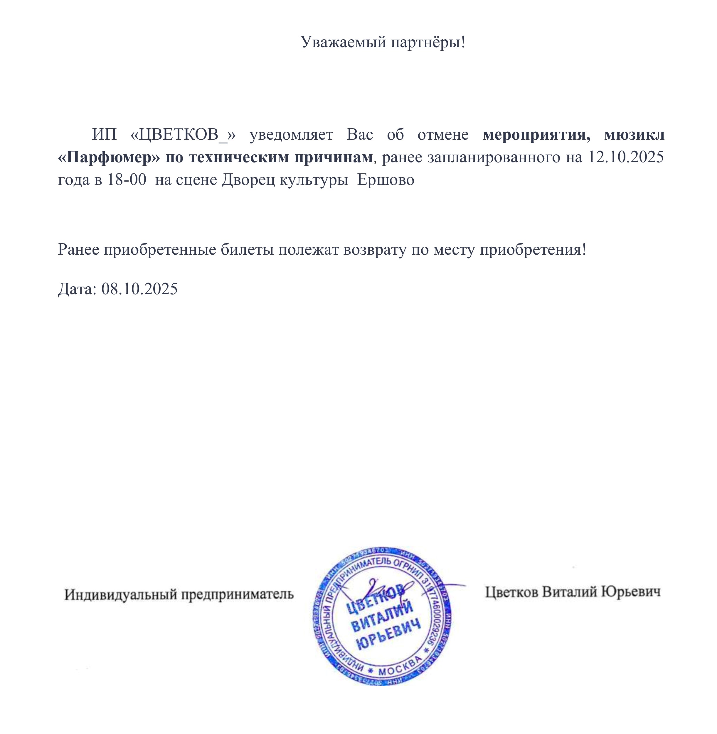 Уважаемый клиент! Спешим сообщить, что по информации, полученной от организатора, Мюзикл «Парфюмер», запланированный на 12 октября 2025 года в 18.00 ДК Ершово, отменён. Деньги за электронные билеты вернутся автоматически в полном объёме на карту, с которой была произведена оплата. Если вы купили билет в кассе Ticketland.ru за наличный расчет, то обратитесь, пожалуйста, на почту: vozvrat@ticketland.ru. С уважением, команда поддержки Ticketland.