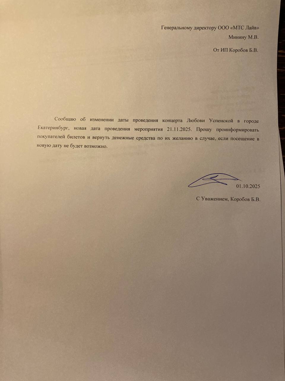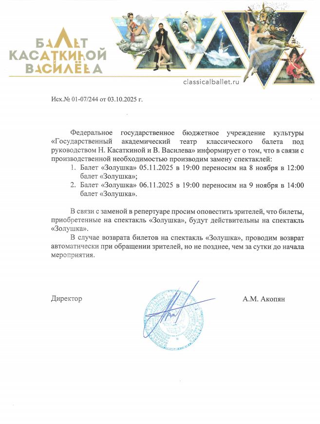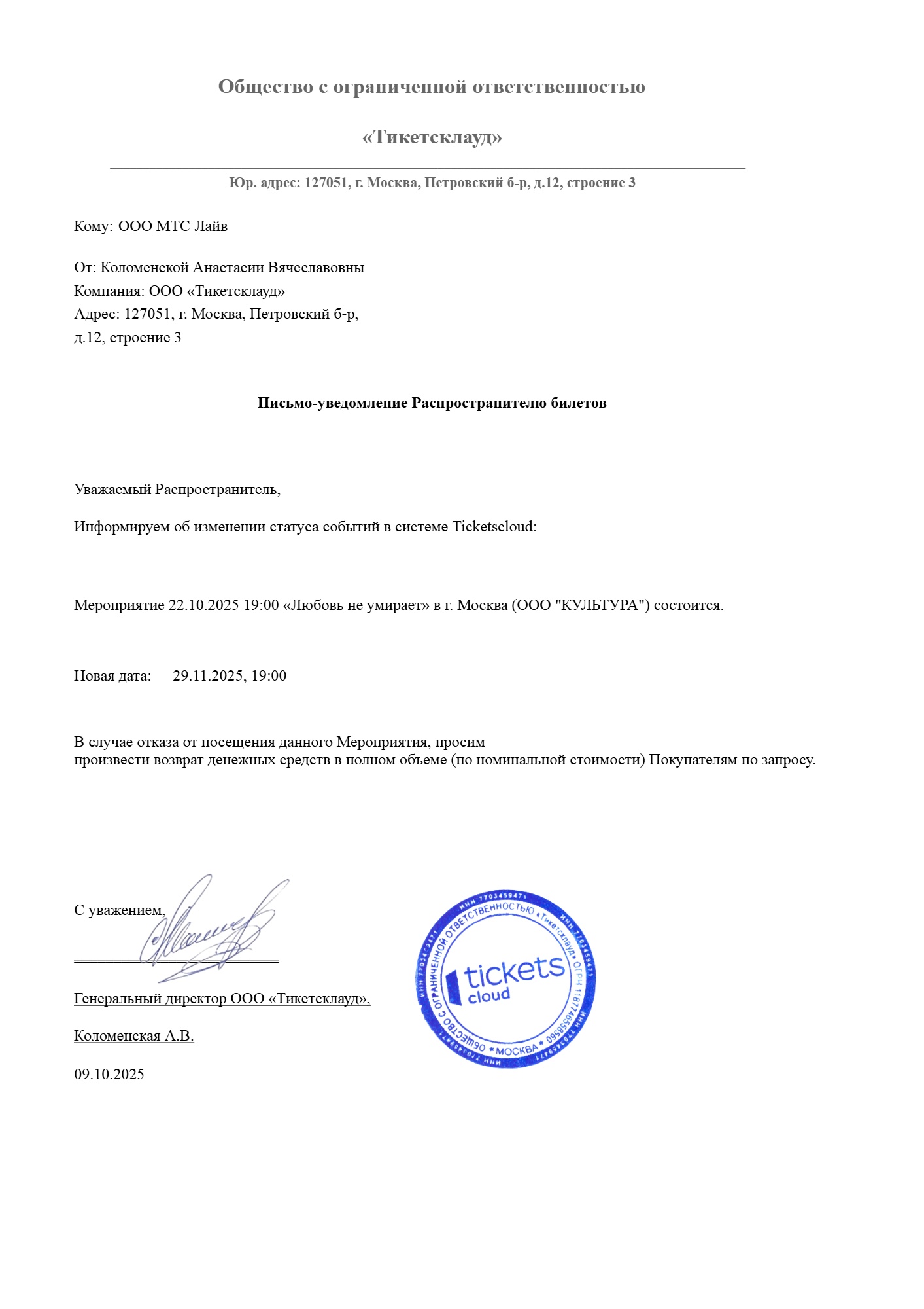 Уважаемый клиент! Спешим сообщить, что по информации, полученной от организатора, спектакль «Любовь не умирает», запланированный на 22 и 23 октября 2025 года в 19:00 в БКЗ «Космос», перенесён на 29 ноября 2025 года, начало в 19:00. Ранее приобретенные билеты действительны на новую дату, обменивать их не нужно. Если вам не удобно посетить спектакль в новую дату, вы можете вернуть билет по кнопке в личном кабинете во вкладке «Заказы» (до 29.11.25 19:00). Деньги за электронные билеты вернутся автоматически в полном объёме на карту, с которой была произведена оплата. Если вы купили билет в кассе Ticketland.ru за наличный расчет, то обратитесь, пожалуйста, на почту: vozvrat@ticketland.ru. С уважением, команда поддержки Ticketland.