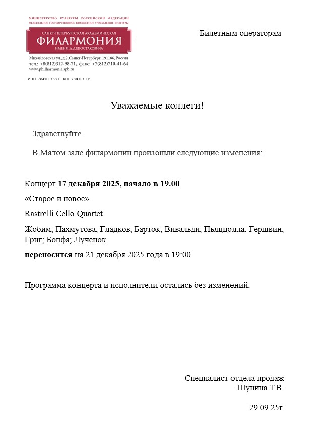 Уважаемый клиент! Спешим сообщить, что по информации, полученной от организатора, концерт ансамбля девяти саксофонов «Novo»», запланированный на 20 ноября 2025 года в 19:00 в Доме музыки, перенесён 22 ноября 2025 года, начало в 19:00. Ранее приобретенные билеты действительны на новую дату, обменивать их не нужно. Если вам не удобно посетить мероприятие в новую дату, вы можете вернуть билет по кнопке в личном кабинете во вкладке «Заказы». Деньги за электронные билеты вернутся автоматически в полном объёме на карту, с которой была произведена оплата. Если вы купили билет в кассе Ticketland.ru за наличный расчет, то обратитесь, пожалуйста, на почту: vozvrat@ticketland.ru. С уважением, команда поддержки Ticketland