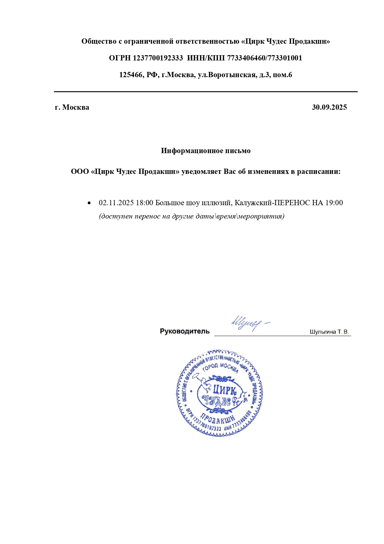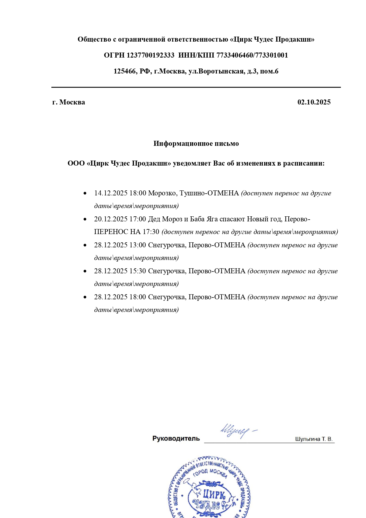 Уважаемый клиент! Спешим сообщить, что по информации, полученной от организатора, спектакль «Снегурочка», запланированный на 31.12.2025 в 11:00 в Цирке Чудес, переносится на 30.12.2025 в 12.00. По вопросам возвратов и обменов билетов зрители могут обращаться по тел. +7 (495) 445 49 45, или написав на почту office@aivengo-t.ru С уважением, команда поддержки Ticketland.