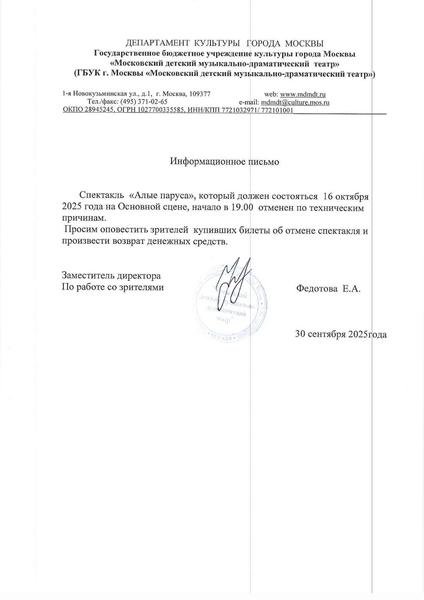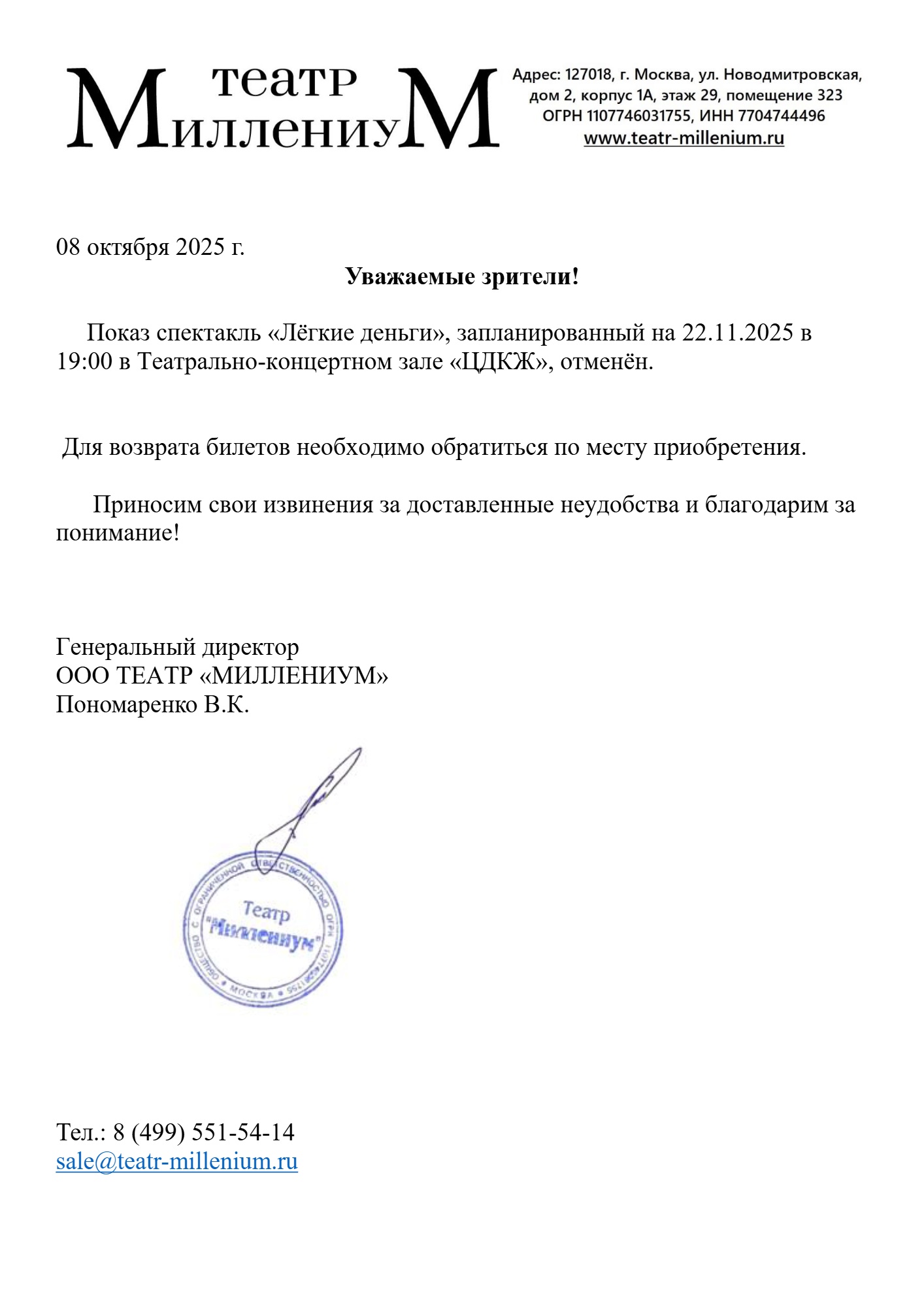Уважаемый клиент! Спешим сообщить, что по информации, полученной от организатора, спектакль «Ромео и Джульетта. Вариация», запланированный на 22 октября 2025 года в 18:30 во Дворце Молодёжи, отменён. Деньги за электронные билеты вернутся автоматически в полном объёме на карту, с которой была произведена оплата. Если вы купили билет в кассе Ticketland.ru за наличный расчет, то обратитесь, пожалуйста, на почту: vozvrat@ticketland.ru. С уважением, команда поддержки Ticketland.