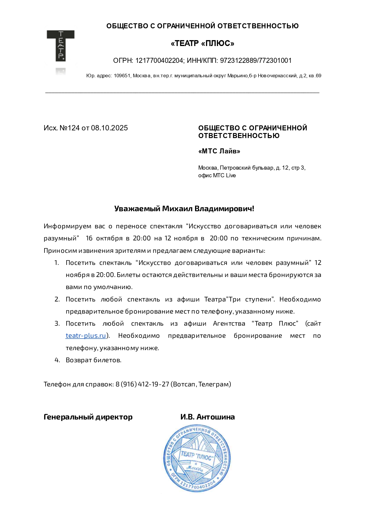 Уважаемый клиент! Спешим сообщить, что по информации, полученной от организатора, спектакль «Козявочка», запланированный на 18.10.2025 в 12.00 в Клоун-мим-театре «Мимигранты», заменяется на спектакль «Озорные выкрутасы». Ранее приобретенные билеты действительны, обменивать их не нужно. Если вам не удобно посетить мероприятие в новую дату, вы можете вернуть билет по кнопке в личном кабинете во вкладке «Заказы» (до 2025-10-18 12:00:00). Деньги за электронные билеты вернутся автоматически в полном объёме на карту, с которой была произведена оплата. Если вы купили билет в кассе Ticketland.ru за наличный расчет, то обратитесь, пожалуйста, на почту: vozvrat@ticketland.ru. С уважением, команда поддержки Ticketland