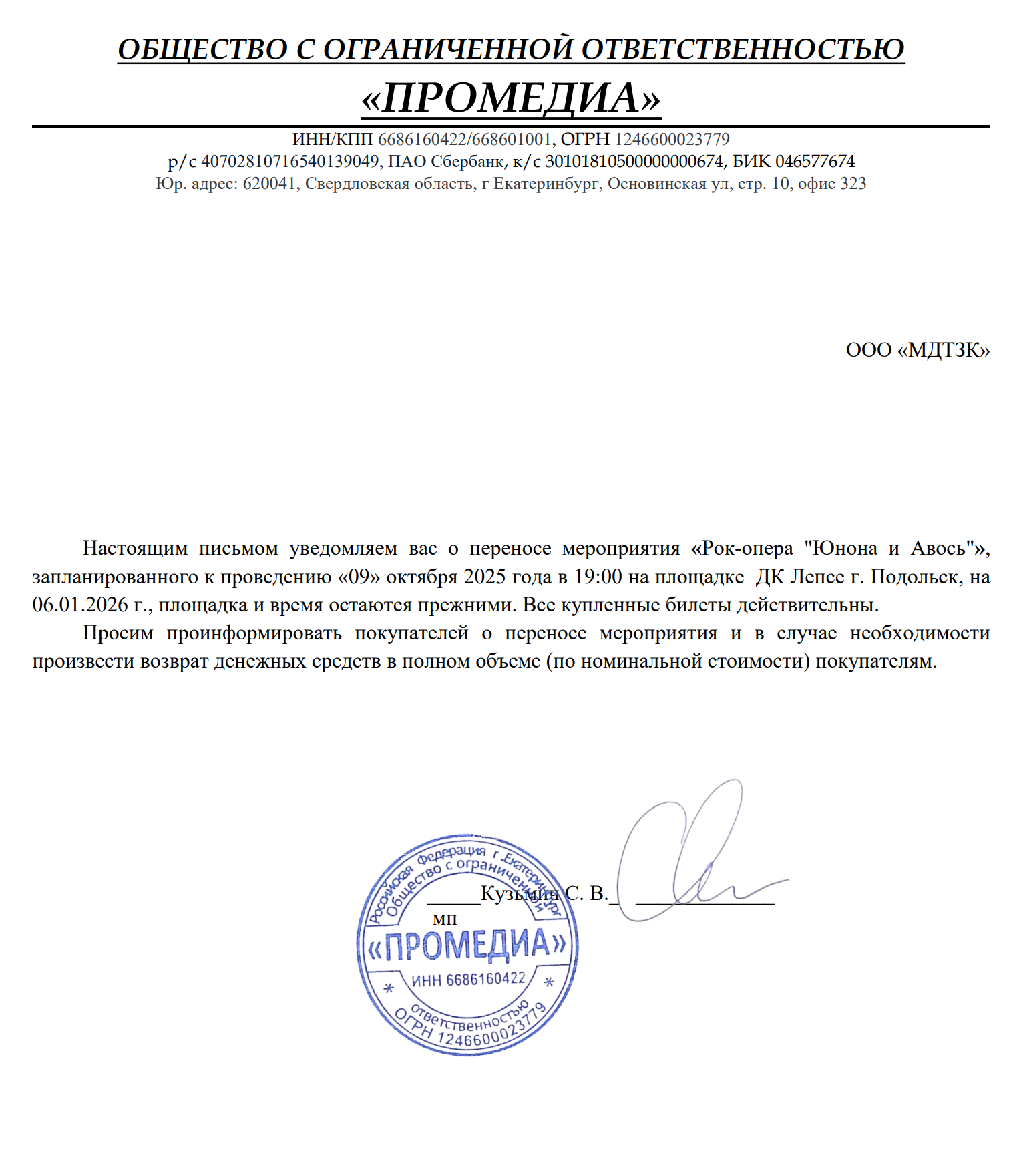 Уважаемый клиент! Спешим сообщить, что по информации, полученной от организатора, концерт «Легендарные хиты Depeche Mode «Enjoy the symphony» show с оркестром», запланированный на 10 февраля 2025 года в 18:30 в ДК Железнодорожник, перенесен на 19 октября 2025 г., начало в 19:00, и на новую площадку: ДК Нефтяник (ул. Осипенко, 1, Тюмень). Ранее приобретенные билеты требуют обмена. Для обмена билетов зрителям необходимо сообщить о своем намерении поменять билеты на новую дату и площадку, направив билеты на первоначальную дату и чек на адрес электронной почты организатора annetskakun@yandex.ru. В ответном письме Вас проинформируют о новых местах и после вашего подтверждения вышлют новые билеты. С уважением, команда поддержки Ticketland