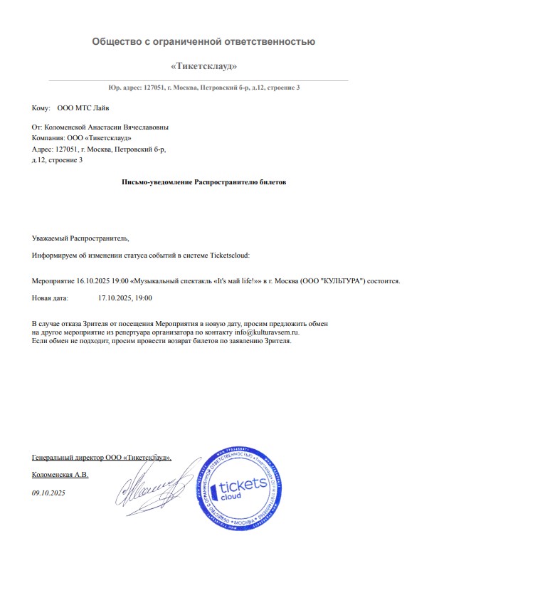 Уважаемый клиент! Спешим сообщить, что по информации, полученной от организатора, мюзикл «It's май life!», запланированный на 16 октября 2025 года в 19:00 в БКЗ «Космос», перенесён на 17 октября 2025 года, начало в 19:00. Организатор предлагает обмен билетов на другое мероприятие из репертуара организатора. По вопросам обмена обращайтесь, пожалуйста, к организатору по электронной почте info@kulturavsem.ru. Ранее приобретенные билеты действительны на новую дату, обменивать их не нужно. Если вам не удобно посетить спектакль в новую дату, вы можете вернуть билет по кнопке в личном кабинете во вкладке «Заказы». Деньги за электронные билеты вернутся автоматически в полном объёме на карту, с которой была произведена оплата. Если вы купили билет в кассе Ticketland.ru за наличный расчет, то обратитесь, пожалуйста, на почту: vozvrat@ticketland.ru. С уважением, команда поддержки Ticketland.