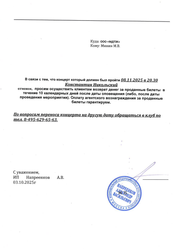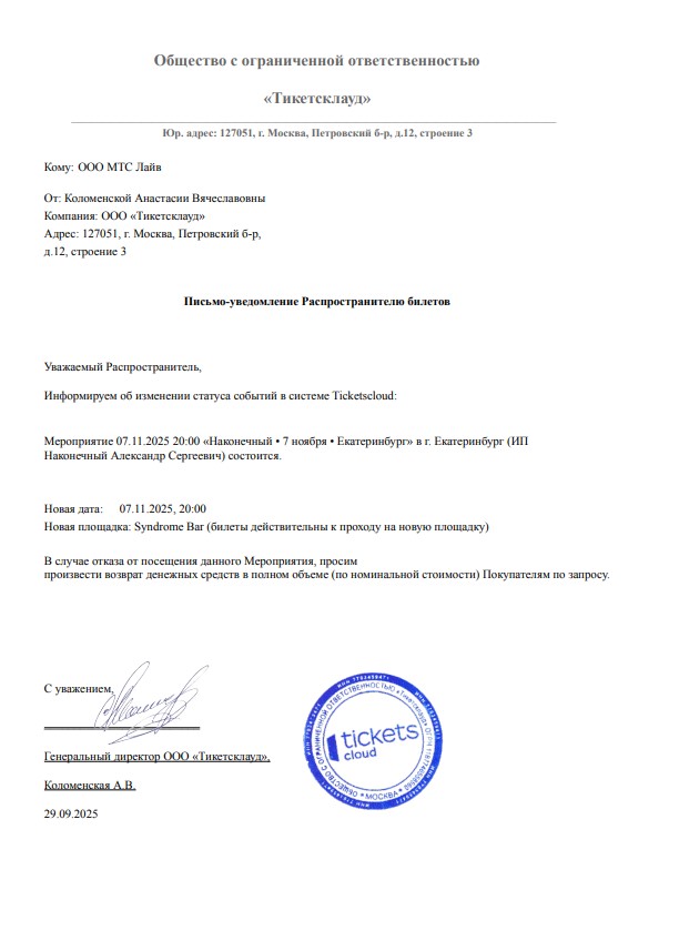 Уважаемый клиент! Спешим сообщить, что по информации, полученной от организатора, концерт группы «Конец фильма», запланированный на 10 октября 2025 года в 19:00 в ДК «Тепловозостроитель», отменён. Деньги за электронные билеты вернутся автоматически в полном объёме на карту, с которой была произведена оплата. Если вы купили билет в кассе Ticketland.ru за наличный расчет, то обратитесь, пожалуйста, на почту: vozvrat@ticketland.ru С уважением, команда поддержки Ticketland.