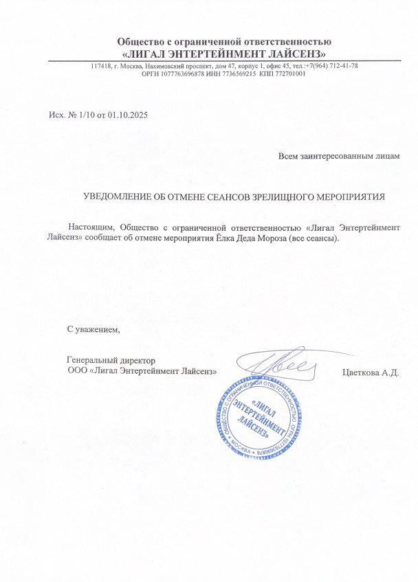 Уважаемый клиент! Спешим сообщить, что по информации, полученной от организатора, спектакль «Снегурочка», запланированный на 30.12.2025 в 14:30 вЦирке Чудес, отменён. По вопросам возвратов и обменов билетов зрители могут обращаться по тел. +7 (495) 445 49 45, или написав на почту office@aivengo-t.ru С уважением, команда поддержки Ticketland.
