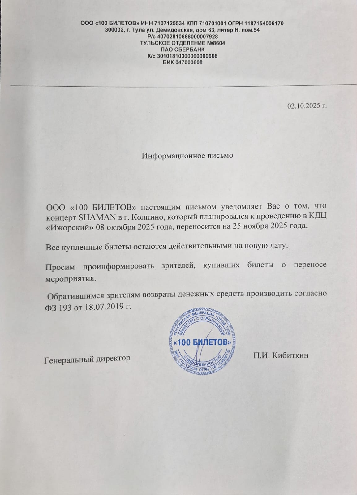 Уважаемый клиент! Спешим сообщить, что по информации, полученной от организатора, концерт «MetalliadA: Баллада Тысячи Свечей. Metallica, Scorpions, Bon Jovi, Guns N' Roses», запланированный на 09 октября 2025 года в 19:00 в ДК «Туламашзавод», перенесён на 25 октября 2025 года, начало в 19:00. Ранее приобретенные билеты действительны на новую дату, обменивать их не нужно. Если вам не удобно посетить концерт в новую дату, вы можете вернуть билет по кнопке в личном кабинете во вкладке «Заказы». Деньги за электронные билеты вернутся автоматически в полном объёме на карту, с которой была произведена оплата. Если вы купили билет в кассе Ticketland.ru за наличный расчет, то обратитесь, пожалуйста, на почту: vozvrat@ticketland.ru. С уважением, команда поддержки Ticketland.
