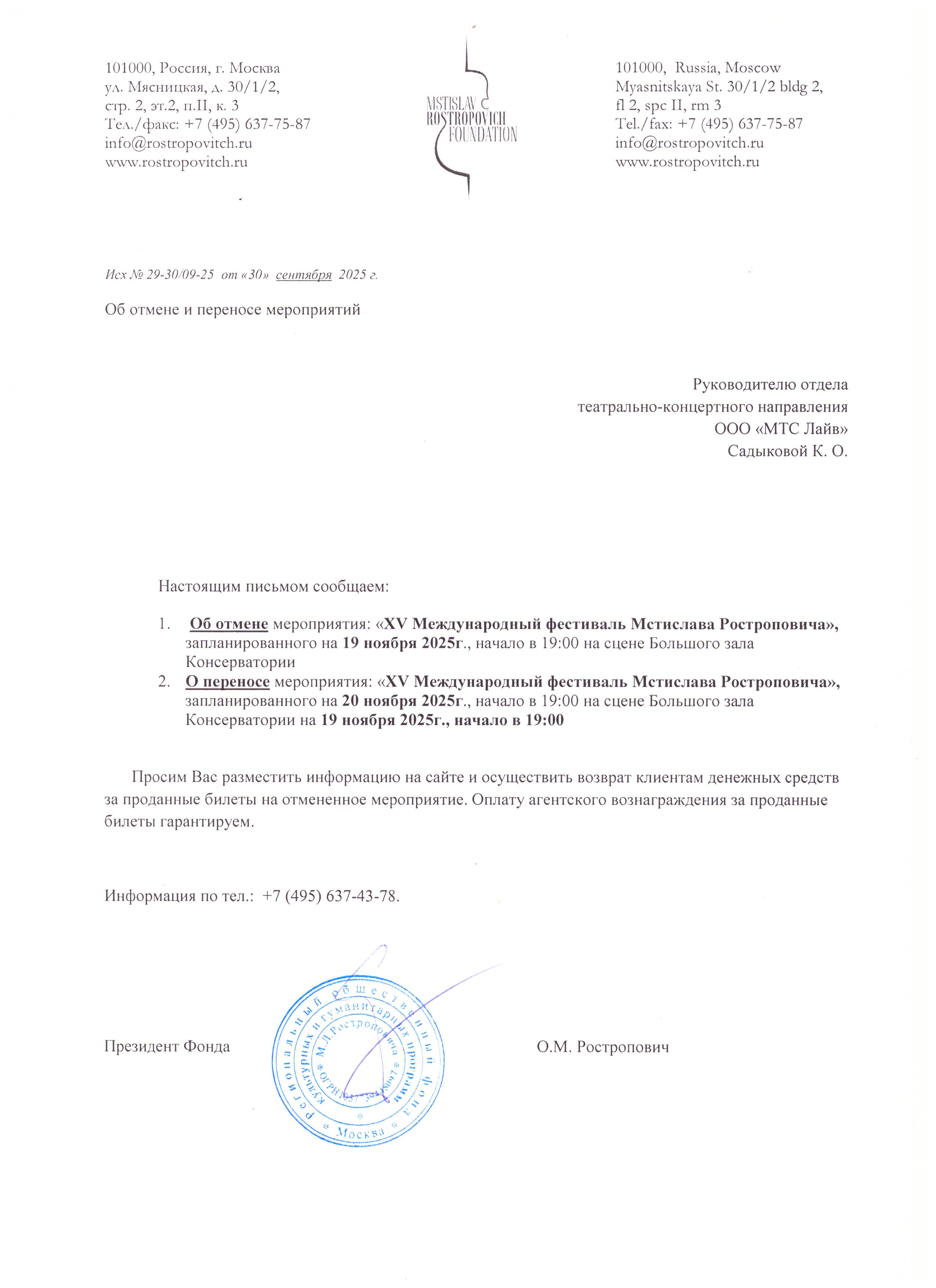 Уважаемый клиент! Спешим сообщить, что по информации, полученной от организатора, концерт «Денис Мацуев представляет. Закрытие Фестиваля», запланированный на 1 ноября 2025 года в 15:00, в Хабаровской краевой филармонии, перенесен. Дата переноса будет объявлена позже. Ранее приобретенные билеты действительны на новую дату, обменивать их не нужно. Если вам не удобно посетить мероприятие в новую дату, вы можете вернуть билет по кнопке в личном кабинете во вкладке «Заказы» (до 2 ноября включительно). Деньги за электронные билеты вернутся автоматически в полном объёме на карту, с которой была произведена оплата. Если вы купили билет в кассе Ticketland.ru за наличный расчет, то обратитесь, пожалуйста, на почту: vozvrat@ticketland.ru. С уважением, команда поддержки Ticketland