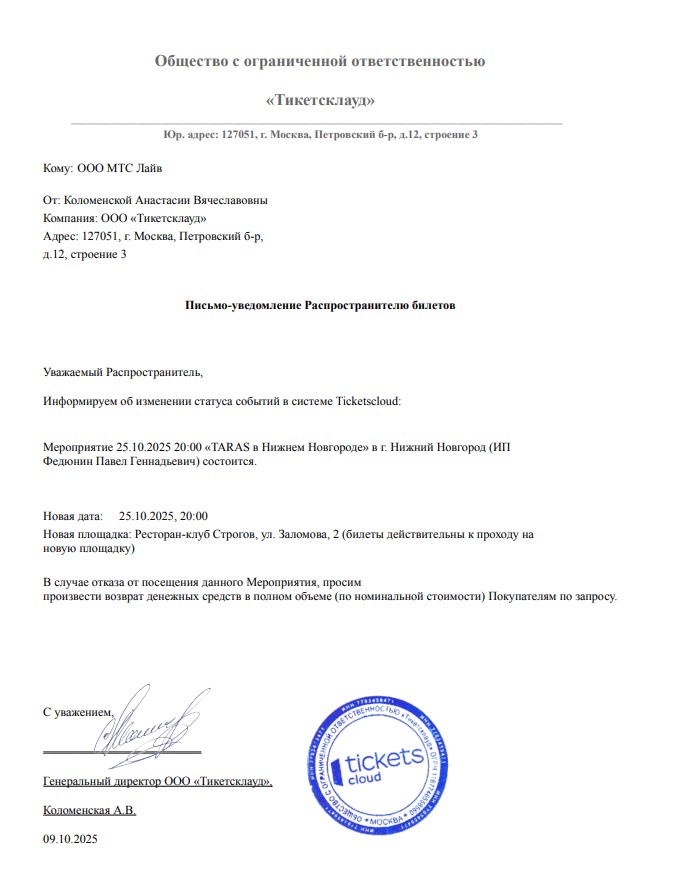 Уважаемый клиент! Спешим сообщить, что по информации, полученной от организатора, концерт Taras, запланированный на 25 октября 2025 года в 20:00 в клубе «Руки Вверх Бар!», перенесён в ресторан «Строгов». Ранее приобретенные билеты действительны на новую площадку, обменивать их не нужно. Если вам не удобно посетить мероприятие на новой площадке, вы можете вернуть билет по кнопке в личном кабинете во вкладке «Заказы» (до начала мероприятия). Деньги за электронные билеты вернутся автоматически в полном объёме на карту, с которой была произведена оплата. Если вы купили билет в кассе Ticketland.ru за наличный расчет, то обратитесь, пожалуйста, на почту: vozvrat@ticketland.ru. С уважением, команда поддержки Ticketland