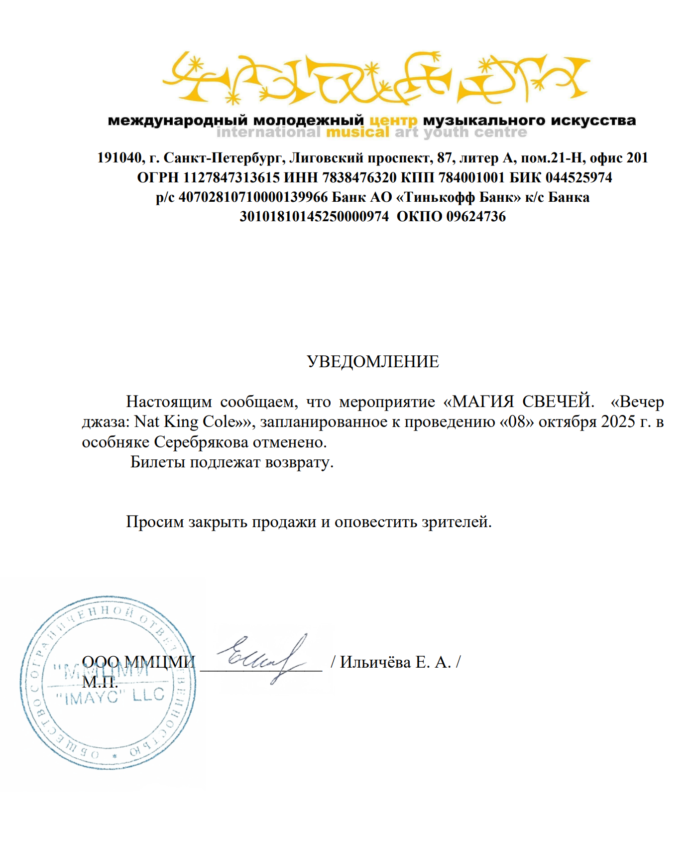 Уважаемый клиент! Спешим сообщить, что по информации, полученной от организатора, концерт Светланы Жаворонковой & Acoustic Soul, запланированный на 11 октября 2025 года в 19:00 в доме музыки, отменён. Деньги за электронные билеты вернутся автоматически в полном объёме на карту, с которой была произведена оплата. Если вы купили билет в кассе Ticketland.ru за наличный расчет, то обратитесь, пожалуйста, на почту: vozvrat@ticketland.ru. С уважением, команда поддержки Ticketland