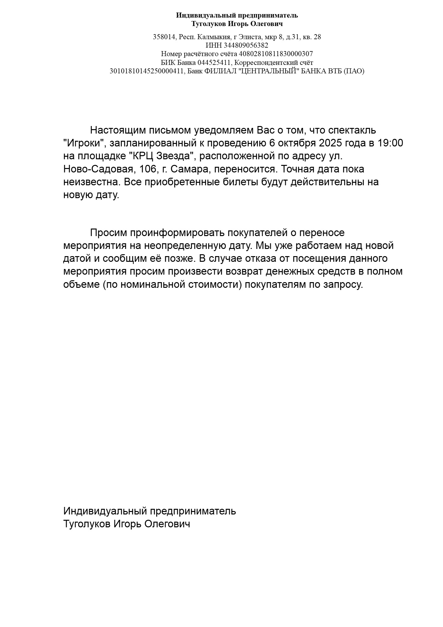 Уважаемый клиент! Спешим сообщить, что по информации, полученной от организатора, Юмористическое шоу г. Пятигорск, запланированное на 9 ноября 2024 года в 19:00 в КРЦ «Звезда», перенесено на 16 октября 2025 года в 19:00. Ранее приобретенные билеты действительны на новую дату, обменивать их не нужно. Если вам не удобно посетить мероприятие в новую дату, вы можете вернуть билет по кнопке в личном кабинете во вкладке «Заказы». Деньги за электронные билеты вернутся автоматически в полном объёме на карту, с которой была произведена оплата. Если вы купили билет в кассе Ticketland.ru за наличный расчет, то обратитесь, пожалуйста, на почту: vozvrat@ticketland.ru. С уважением, команда поддержки Ticketland.